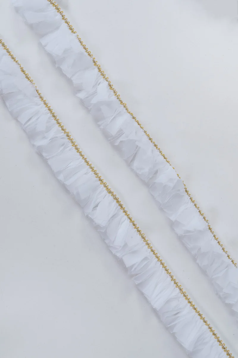 Włoska taśma pasmanteryjna w formie frędzli o długości 3,3cm. Frędzle mają szerokość 1cm i wykończone są od góry złotym sznureczkiem. Taśma idealnie sprawdzi się do wykończenia tkanin gładkich oraz typu chanel.