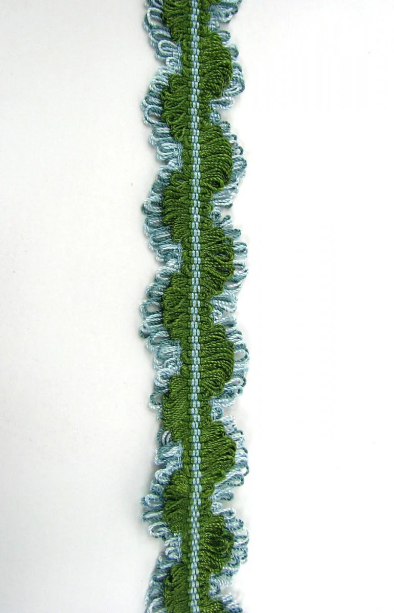 Taśma pasmanteryjna utworzona z dwóch przeplatanych ze sobą sznureczków-w kolorze zielonym i jasnoniebieskim.