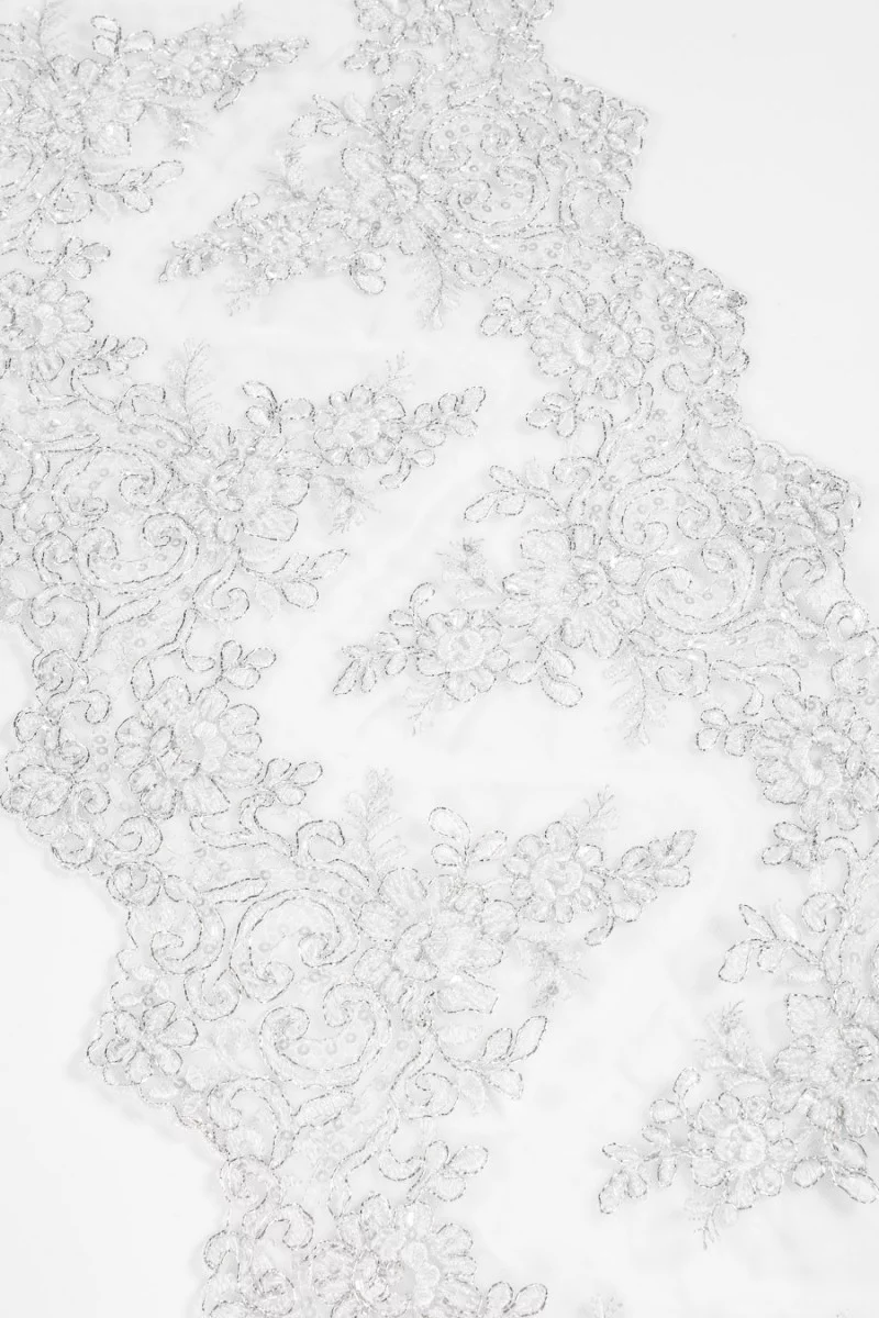 Koronkowa taśma wyszywana kamieniami oraz cekinami. Tkanina jednostronnie wykończona zębem. Idealna na wykończenie sukienek ślubnych.