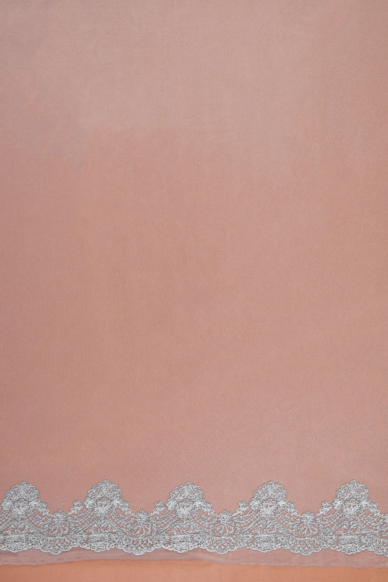 Włoski tiul w kolorze srebrzystym (szaro-zielonym). U dołu haftowany motywem kwiatowym (14 cm) ze srebrną nitką lureksową - ząb do samodzielnego wycięcia. Tkanina transparentna, sztywna z połyskiem (efekt kryształka) - idealna do uszycia sukni ślubnej lub welonu. Szerokość tkaniny to 255 cm.