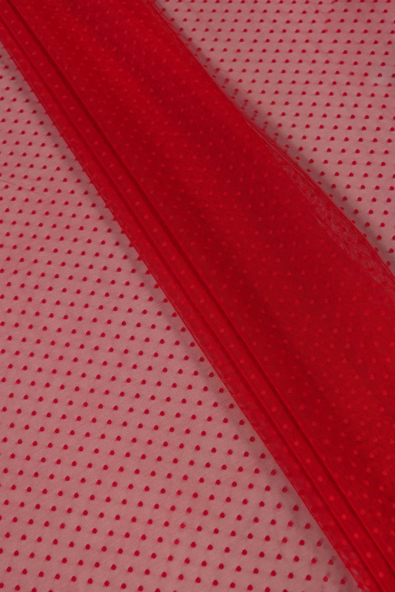 Włoski, miękki tiul w groszki w kolorze czerwonym. Tkanina elastyczna w jedną stronę miękka, przeźroczysta - idealna do uszycia spódnicy, sukienki, bluzki.
