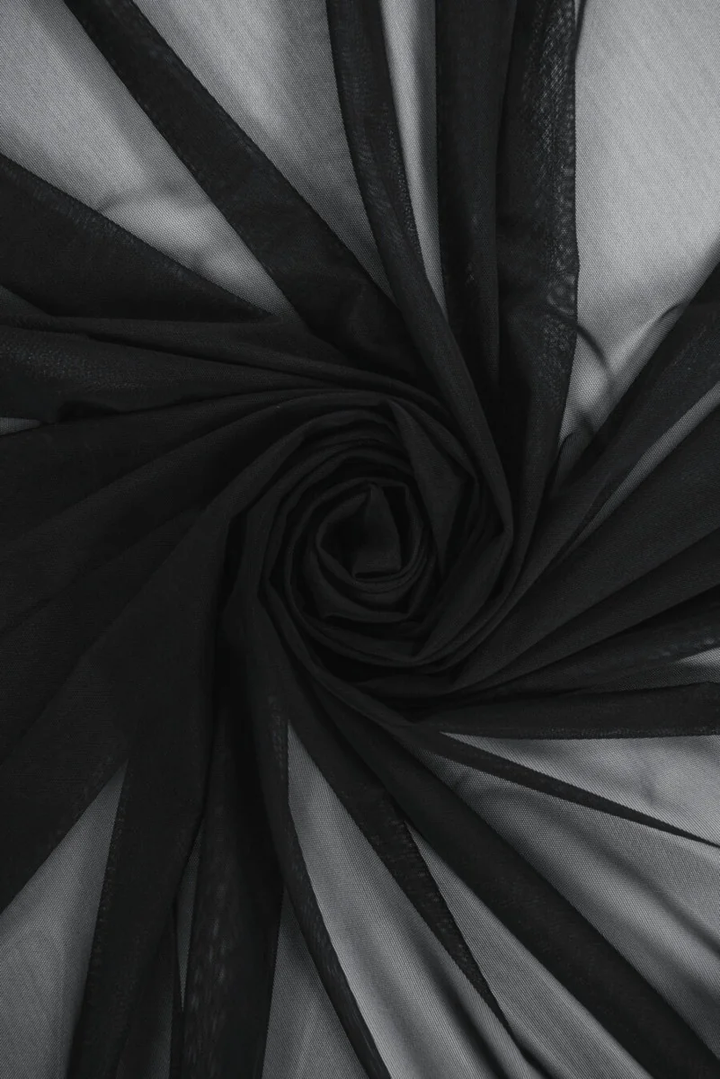Siatka poliamidowa z dodatkiem elastanu w kolorze czarnym, utkana w bardzo małe oczka, delikatna, ciągnie się w dwie strony. Można z niej uszyć: spódnice i sukienki tiulowe, suknie wieczorowe, woalki, halki, kostiumy taneczne, dekoracje.