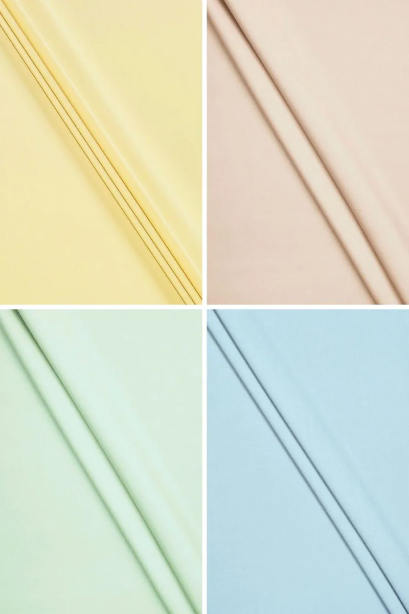 Tkanina ubraniowa w pastelowych, letnich kolorach utkana z poliestru, wiskozy i elastanu. Tkanina jest średniej grubości, miękka i gładka w chwycie, elastyczna oraz dobrze się układa i mało się gniecie. Dobra, tańsza alternatywa zastępująca wełny do uszycia kostiumu, spódnicy czy spodni.