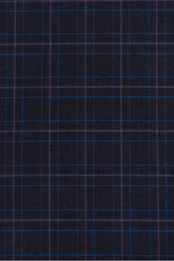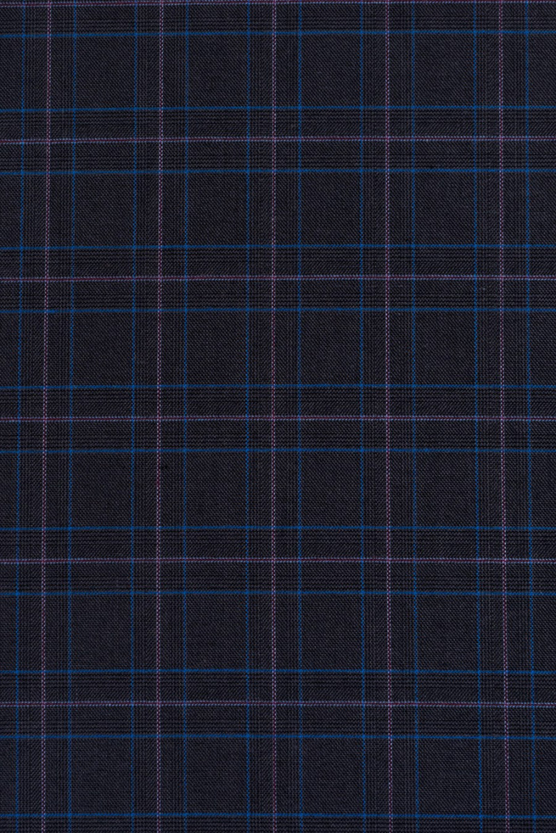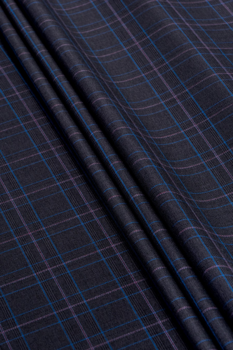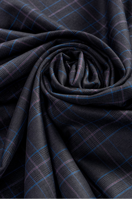 Włoska tkanina kostiumowa wysokiej jakości. Najmodniejszy motyw kratki w kolorach: grafitowy, niebieski, bordowy.