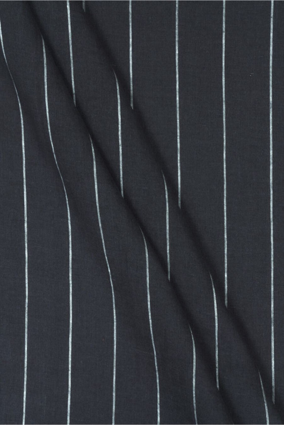 Włoska tkanina 100% lniana z motywem białych pasków na granatowym tle. Wzór jest gęsty, regularny i powtarza się co 4 cm. Tkanina jest cienka, lekka, miękka i nieelastyczna. Jej splot jest luźny, dlatego zalecamy podszewkę dla sukienek czy spódnic z niej uszytych. Klasyczna propozycja idealna na letnie bluzki, koszule, sukienki. Idealna tkanina dla osób szukających ekologicznych rozwiązań w odzieży.