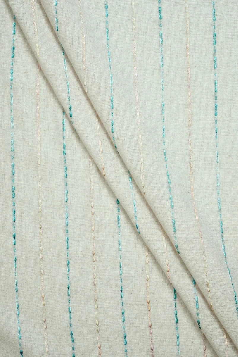 Włoska tkanina utkana z mieszanki lnu i wiskozy w beżowym kolorze z motywem pastelowych pasków, które są wplecione w tkaninę. Regularnie wplecione wąskie paski z dwóch kolorów nitek - turkusowo niebieskiej i różowo beżowej, położone są naprzemiennie w odstępie 3 cm. Tkanina jest miękka, nieelastyczna, matowa oraz wykonana w luźnym splocie. Lekka i pastelowa propozycja idealna na letnie sukienki, bluzki, spódniczki czy szorty.