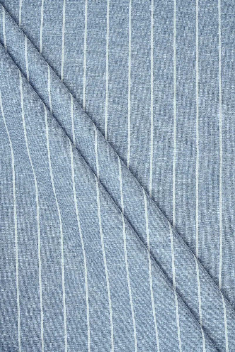 Włoska tkanina utkana z mieszanki lnu i wiskozy z motywem śmietanowych pasków. Paski rozmieszczone są w odległości 2 cm na niebieskim tle, zrobionym w efekcie melanżu, dzięki czemu całość zyskuje efekt spranego koloru. Szerokość jednego paska to 2 mm. Tkanina jest miękka, matowa, nieelastyczna i dość dobrze kryjąca. Doskonale przepuszcza powietrze, co zapewnia wysoki komfort noszenia odzieży z tego gatunku materiałów. Pastelowa kolorystyka z połączeniem klasycznego wzornictwa, idealnie sprawdzi się na letnią odzież, taką jak spodnie, szorty, sukienki i spódnice.