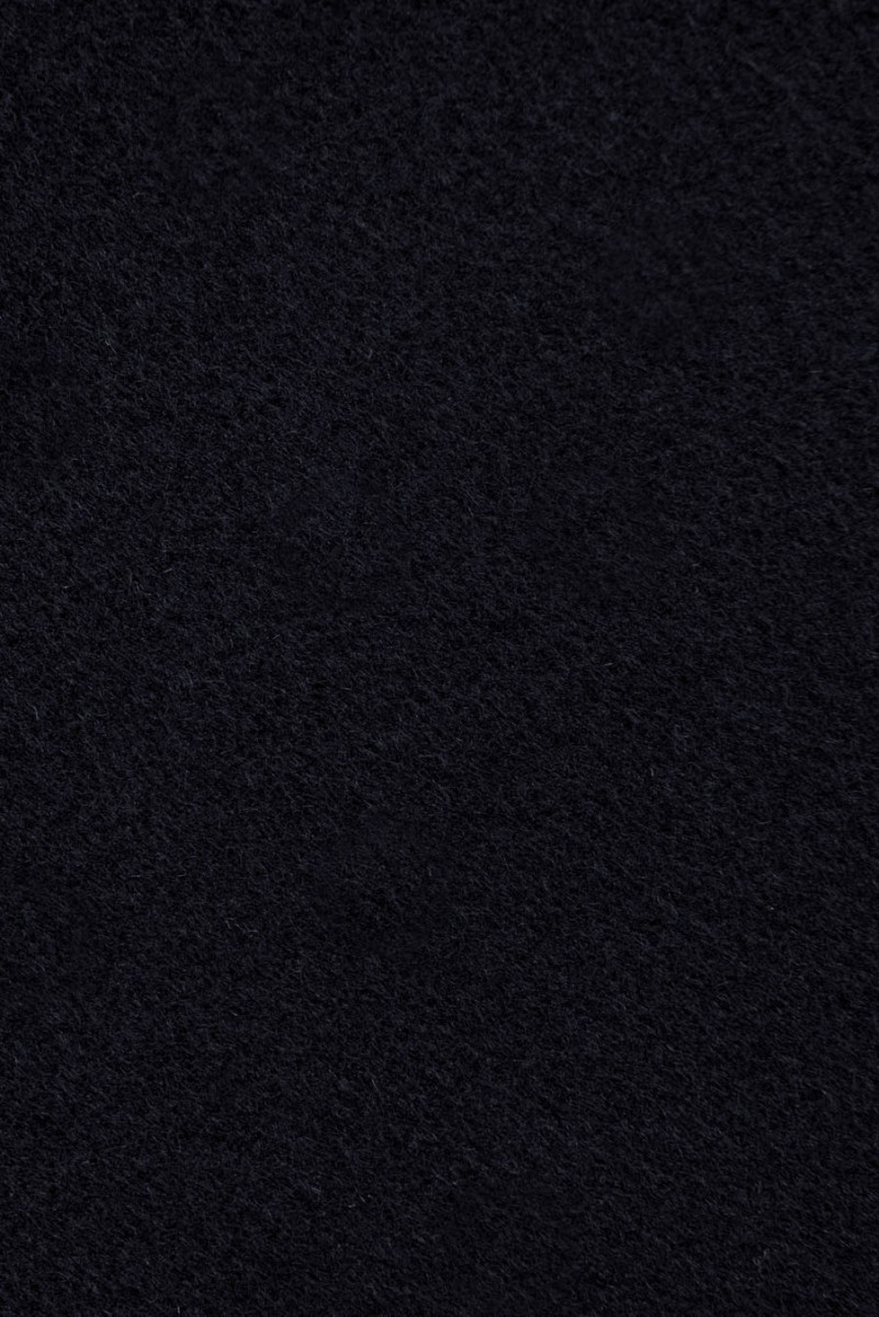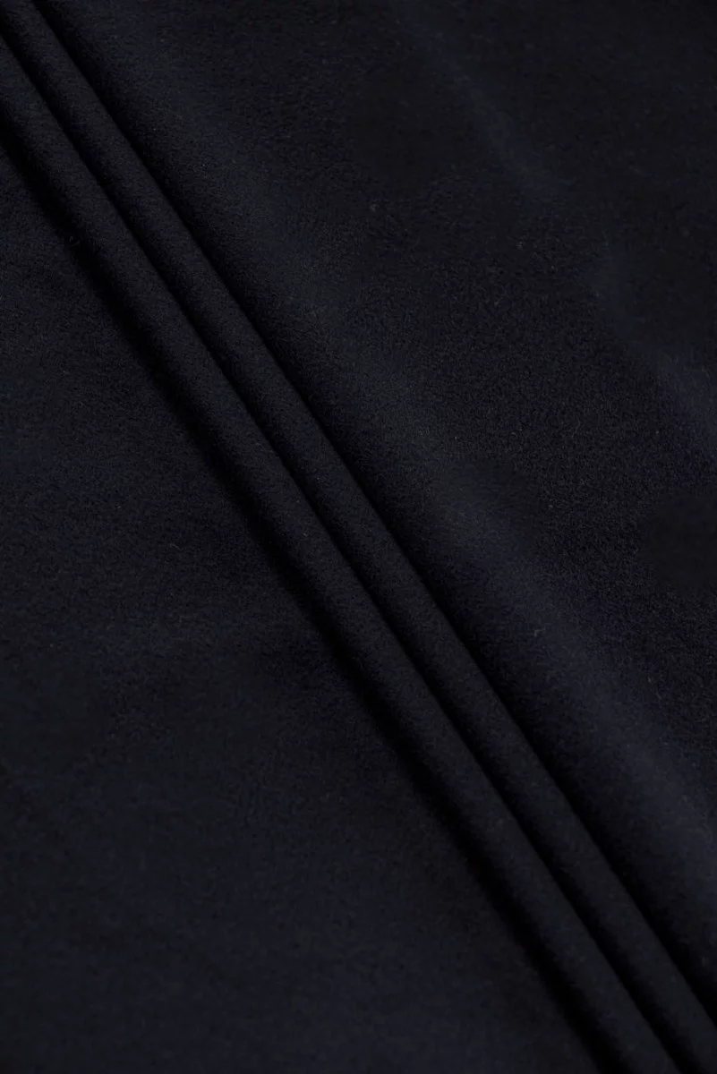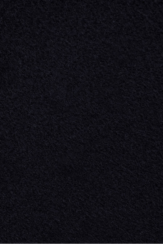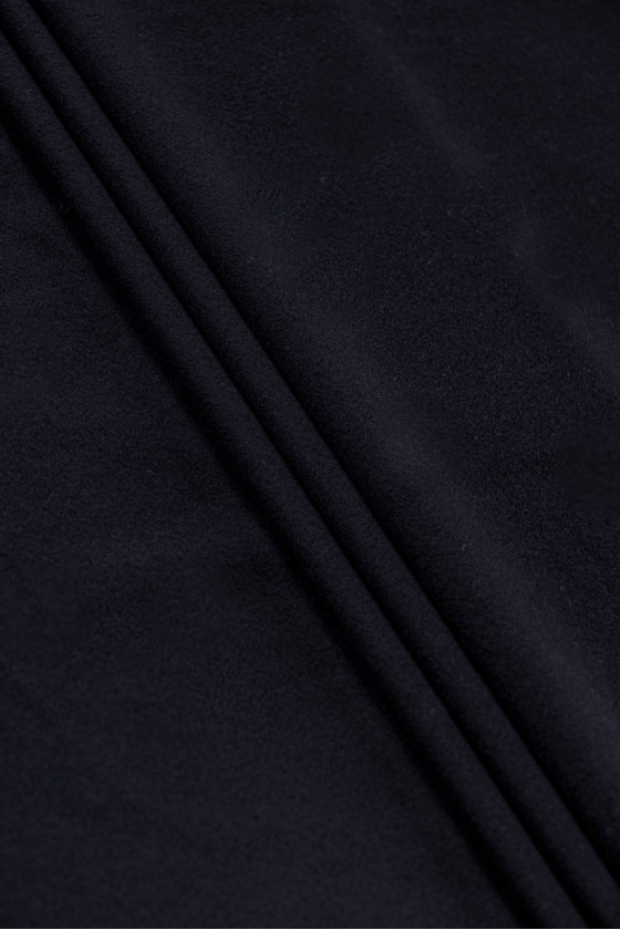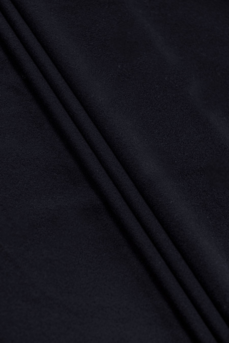 Włoska tkanina płaszczowa w kolorze bardzo ciemnego granatu - prawie czarna. Utkana z wełny naturalnej i kaszmiru. Tkaniny wełniane idealnie nadają się na okrycia wierzchnie (płaszcz, kurtka, kamizelka) gdyż ogrzewają a jednocześnie pozwalają skórze oddychać. Dodatek kaszmiru sprawia, że ma jeszcze lepsze właściwości izolujące, gdyż kaszmir jest cieplejszy niż wełna owcza. Tkaniny kaszmirowe mają charakterystyczny połysk, są bardzo delikatne, lekkie, miękkie i bardzo przyjemne w dotyku.