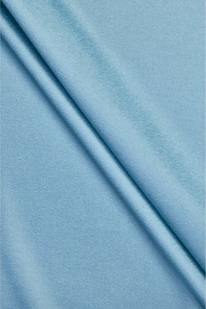 Włoska tkanina płaszczowa utkana z wełny naturalnej z dodatkiem kaszmiru w kolorze niebieskim, z efektem zibellino (delikatne pofalowanie). Tkaniny wełniane idealnie nadają się na okrycia wierzchnie (płaszcz, kurtka, kamizelka) gdyż ogrzewają a jednocześnie pozwalają skórze oddychać.