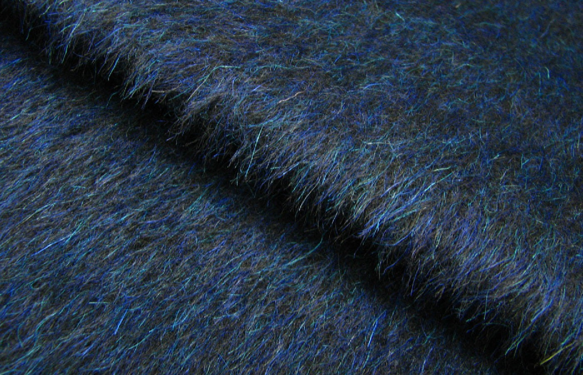 Włoska tkanina płaszczowa w kolorze czarnym z niebieskim i morskim włosem, utkana w 70% z angory i w 30% z moheru.