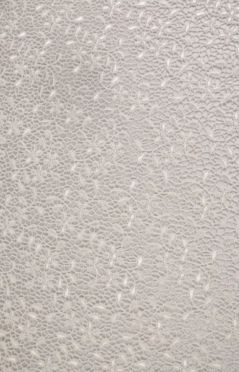 Gęsto tkana koronka gipiurowa w kolorze écru we wzór drobnych kwiatów i listków. Szerokość koronki to 55 cm. Polecamy do uszycia eleganckich sukienek, bluzeczek, na wstawki i wykończenia oraz jako tkaninę dekoracyjną.