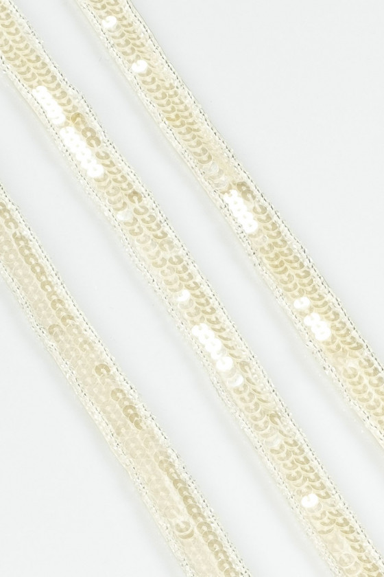 Włoska taśma pasmanteryjna w kolorze ecru. Środek jest ozdobiony cekinami a brzegi obszyte koralikami.
