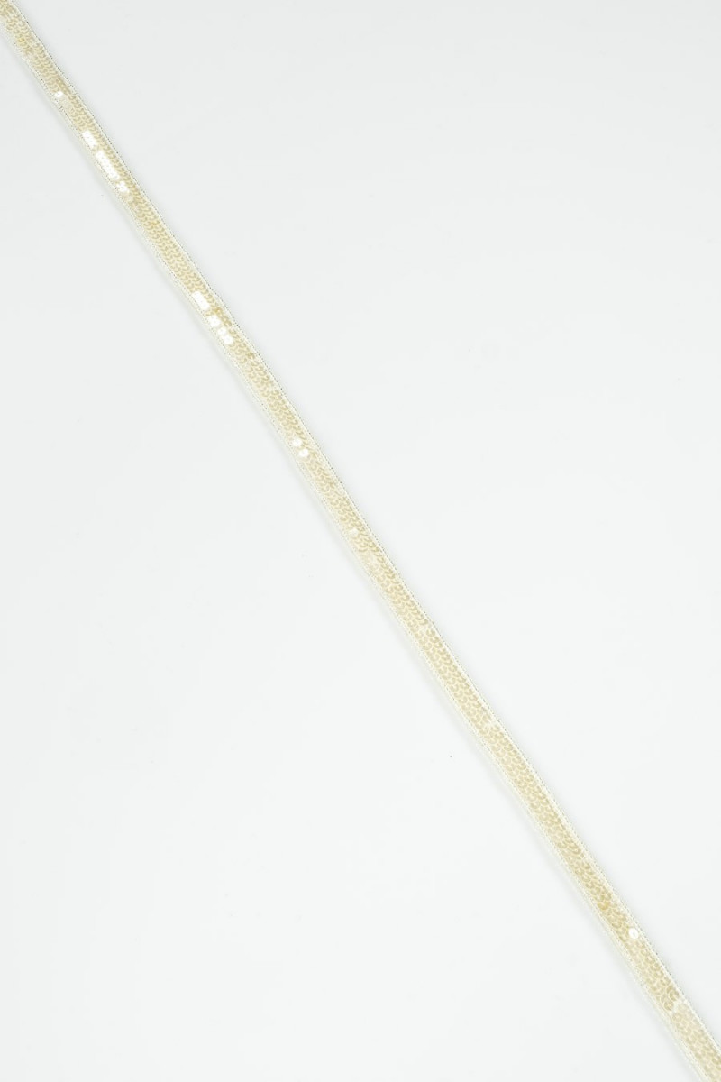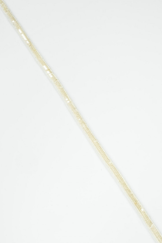 Włoska taśma pasmanteryjna w kolorze ecru. Środek jest ozdobiony cekinami a brzegi obszyte koralikami. Szerokość: 1 cm.