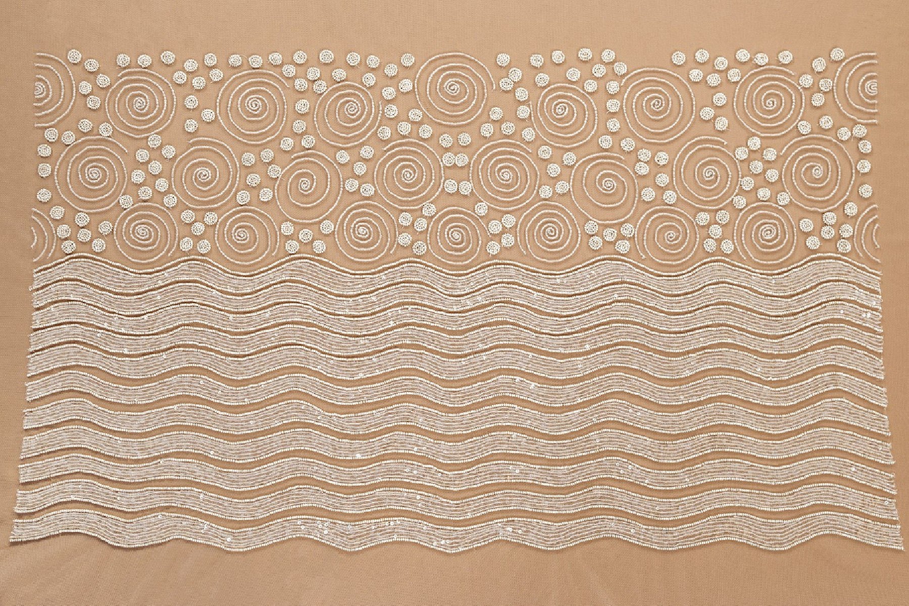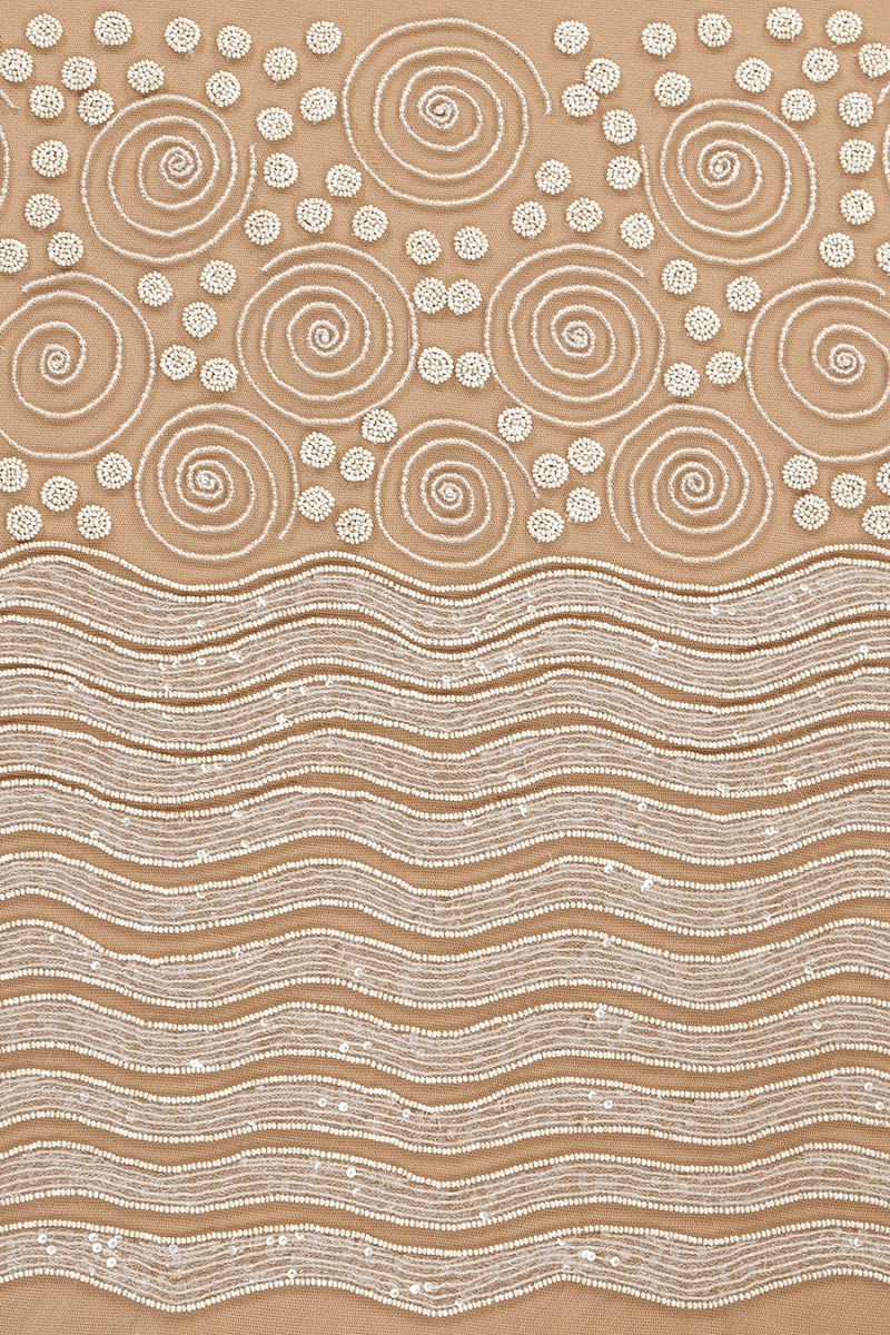 Włoska aplikacja ślubna w formie gorsetu (bluzeczka - przód) w kolorze śmietanowym. Góra aplikacji ma piękny motyw geometrycznych wzorów (6 cm) z przeźroczystych koralików, dopełniony drobniejszymi groszkami (1,5 cm) w kolorze perłowym, dół z motywem fal (1,8 cm) wypełnionych przeźroczystymi cekinami i otoczonych perłowymi koralikami. Całość jest naszyta na miękkim tiulu. Piękna ozdoba do sukni ślubnej lub wieczorowej.