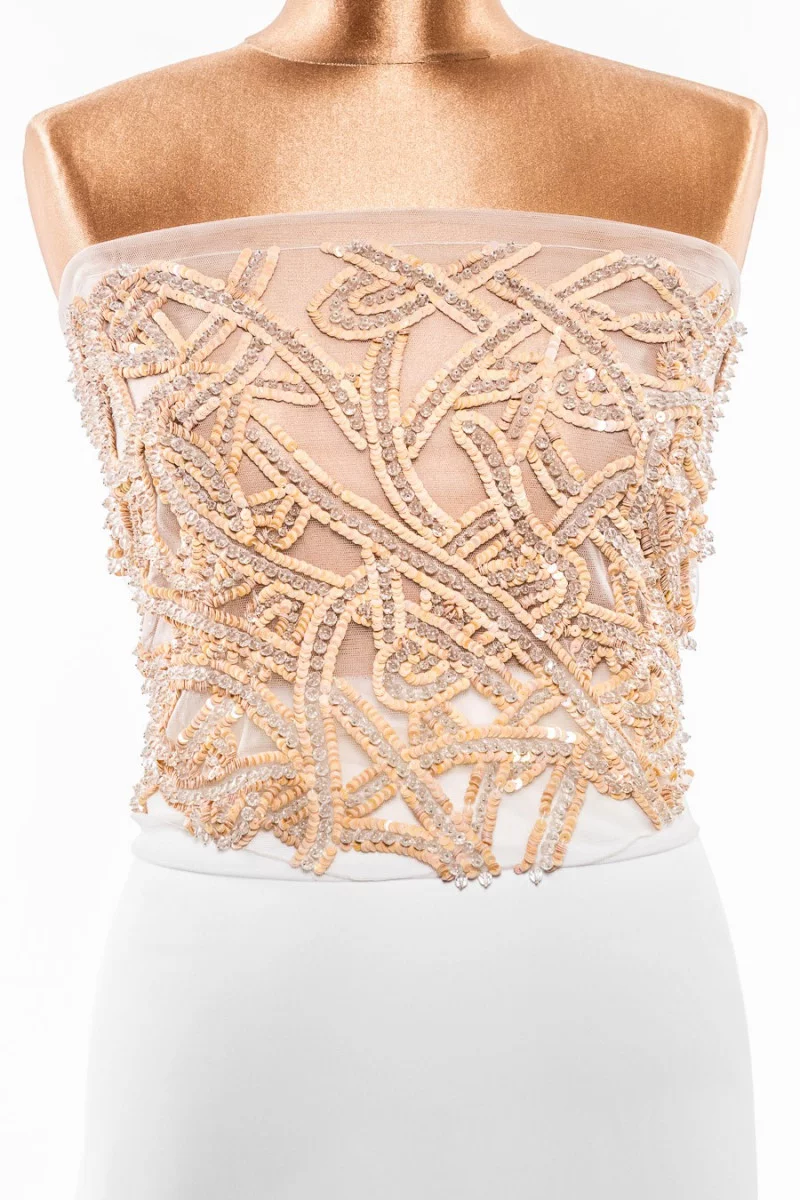 Włoska aplikacja w formie gorsetu (przód). Piękny, fantazyjny wzór zrobiony z cekin w kolorze morelowym i dużych, przeźroczystych koralików. Całość jest naszyta na miękkiej siatce tiulowej w kolorze śmietanowym.