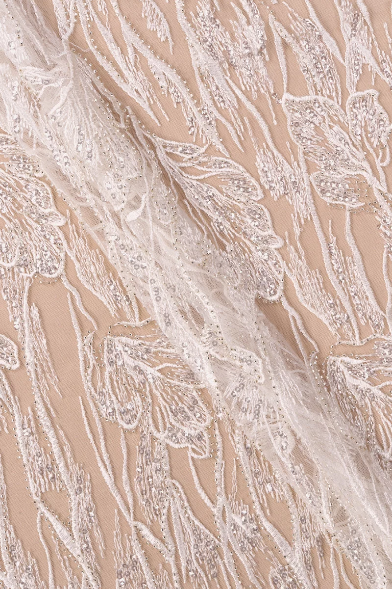 Włoska koronka w kolorze écru z gęstym motywem kwiatowym, ozdobionym platynowymi koralikami oraz srebrnymi cekinami. Koronka wykonana z nieelastycznego tiulu, obustronnie wykończona ozdobnym zębem - szyjemy ją obwodowo. Piękna propozycja do uszycia sukni ślubnej lub eleganckiej bluzki, sukienki oraz spódnicy.