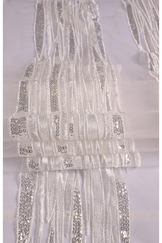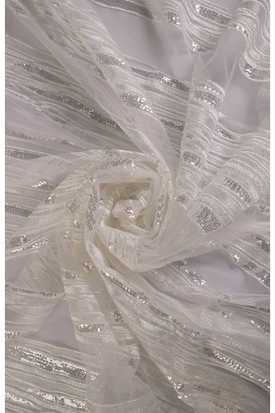 Koronka ślubna wyszywana w oryginalny wzór dużych pasów (od 10-22 cm), do których przyszyte są srebrne cekiny, dzięki czemu tkanina dyskretnie mieni się. Struktura średnio sztywna. Kolor- biała śmietanka