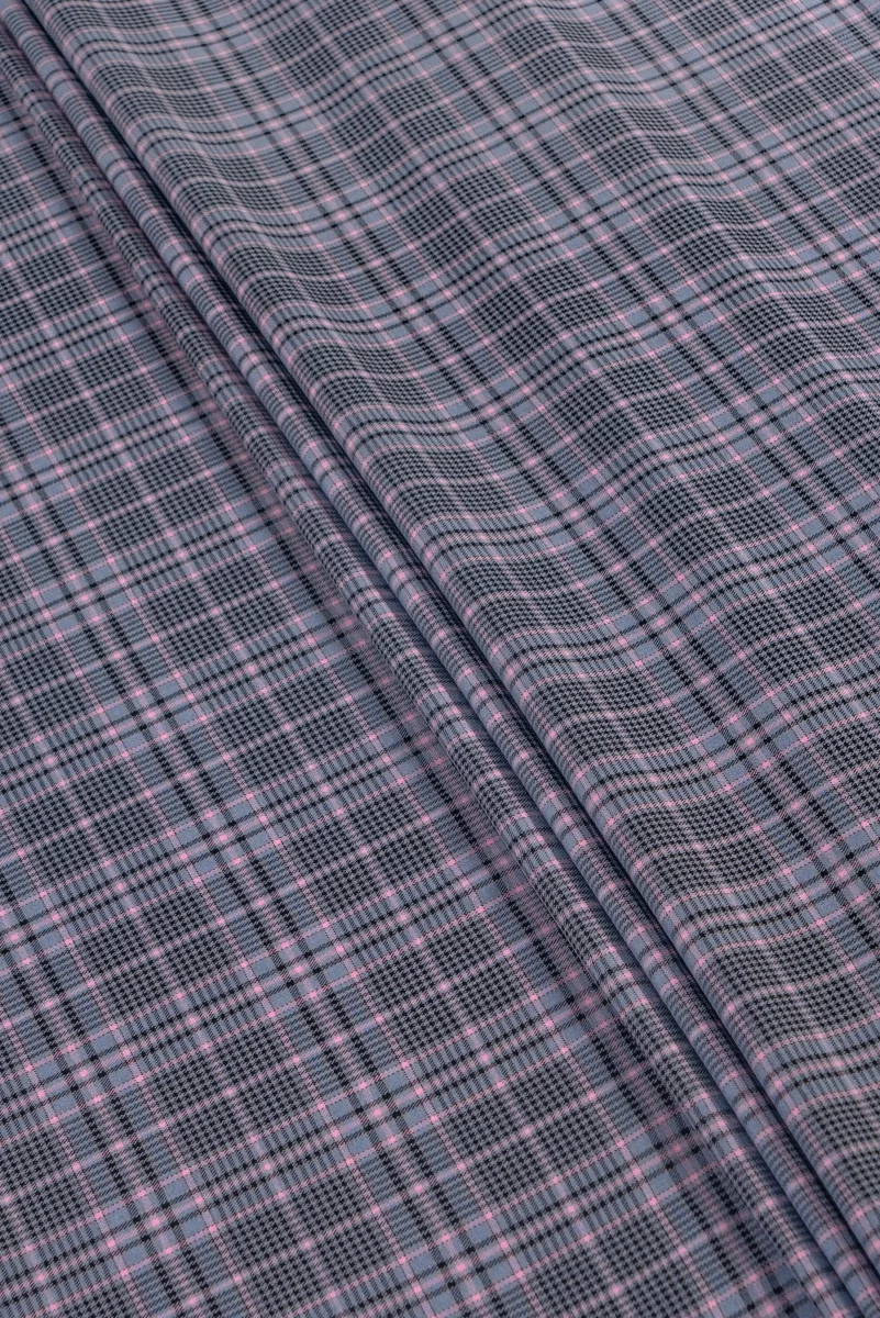 Włoska tkanina kostiumowa z motywem kratki w kolorach szarym, czarnym, różowym i niebieskim. Tkanina miękka, lekko elastyczna z gatunku jesienno-zimowych.