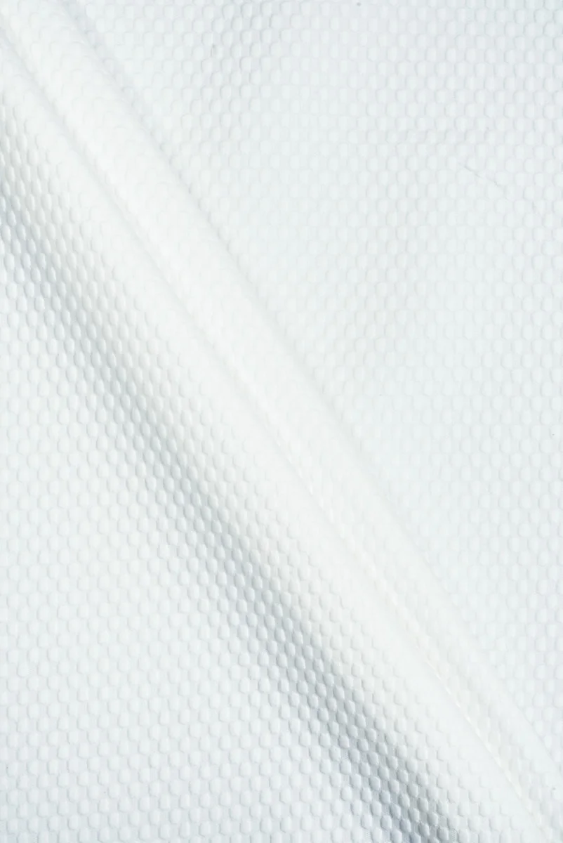 Tkanina poliestrowa z motywem wypukłych bąbli w śmietanowym kolorze. Gęsto położony wzór jest mały i regularny. Tkanina jest średniej grubości, kryjąca, elastyczna, miękka i lekka. Na całość materiału naklejona jest bardzo cienka, kryjąca warstwa, która sprawia, że tkanina przypomina piankę. Interesująca propozycja z której można uszyć marynarki, sukienki, spódniczki, kostiumy oraz lekkie płaszcze lub kurtki.