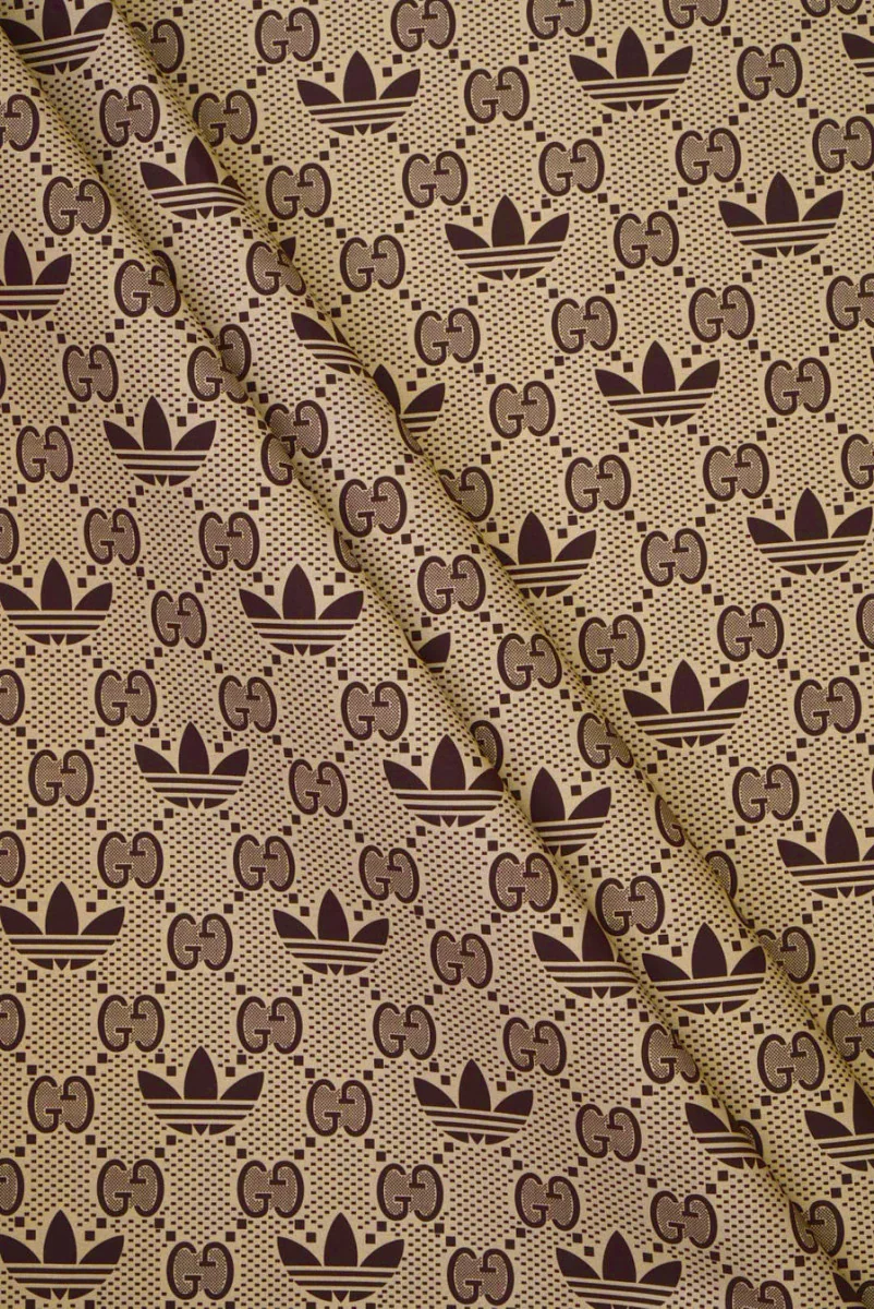 Włoska tkanina trenczowa z brązowymi motywami charakterystycznymi dla światowych marek odzieżowych na beżowym tle. Wzór jest regularny i gęsty, rozmiar największego elementu to niecałe 5 cm * 3,5 cm. Materiał składa się z dwóch warstw, które są ze sobą sklejone, wewnętrzna warstwa jest gładka i czarna. Ze względu na kierunek położonego wzoru zalecamy szycie obwodowe. Tkanina jest raczej cienka, ale kryjąca, nieelastyczna, matowa i układa się sztywno. Polecamy ją przede wszystkim na trencze, lekkie płaszczyki.