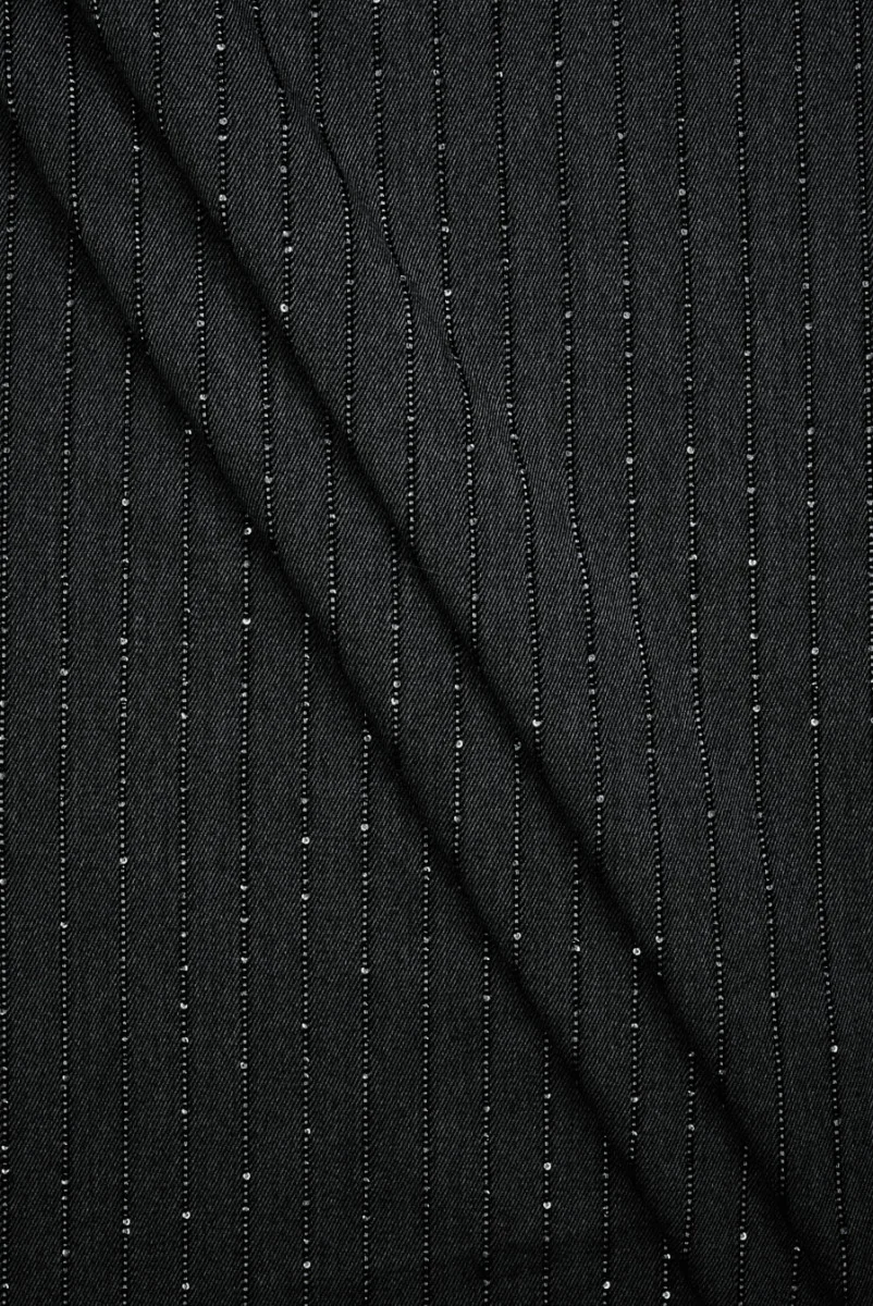 Włoska tkanina kostiumowa w kolorze grafitowym z motywem wąskich pasków. Paski rozmieszczone są regularnie w odległości 1,5 cm oraz zdobione malutkimi cekinami, szerokość jednego paska to 2 mm. Tkanina jest średniej grubości, miękka, kryjąca, wykonana w delikatnym splocie diagonalnym oraz lekko elastyczna na nitkach. Doskonała propozycja na marynarki, spodnie, sukienki czy spódnice.