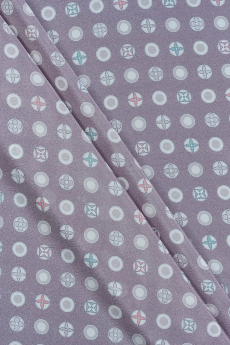 Włoska tkanina utkana w 100% z acetatu z motywem małych znaczków na tle w kolorze bordowym ale bardzo rozbielonym. Regularnie położone kółeczka w odstępie 1 cm mają wzory w środku znanej marki modowej. Jeden graficzny motyw ma średnicę 12 mm. Tkanina jest lekka, zwiewna, nieelastyczna, dość cienka i wykończona jest połyskiem. Bardzo interesująca propozycja na bluzki, koszule, spódnice. Można ją użyć również jako podszewkę.