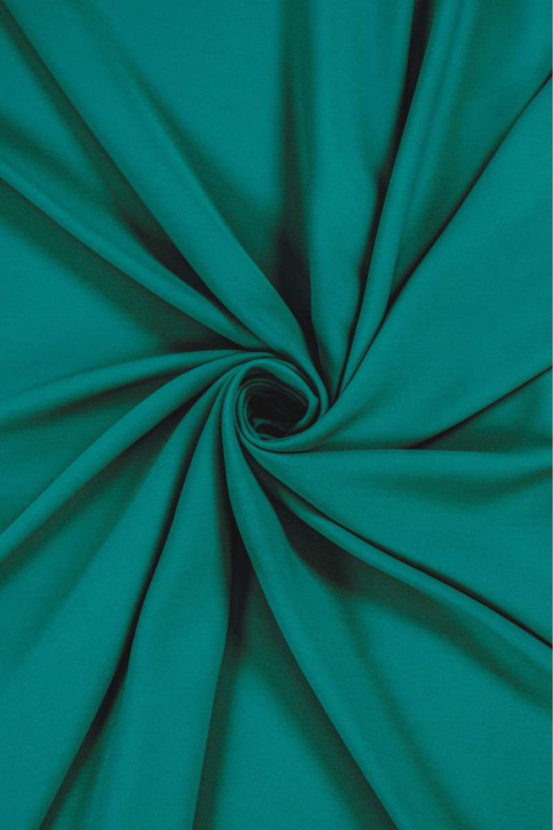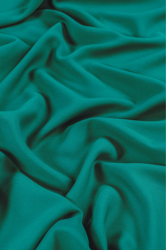 Włoska tkanina sukienkowa typu cadi w kolorze morskiej zieleni. Tkanina typu cadi jest kryjąca, mięsista, spływająca (ciężka). Mieszanka wiskozy i poliestru.