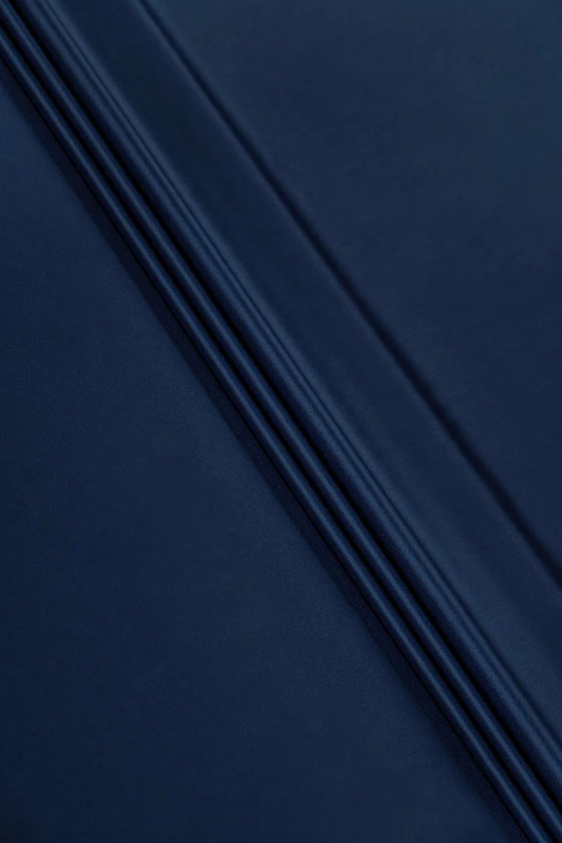 Włoska tkanina sukienkowa typu cadi w kolorze jasnego granatu. Tkanina z jednej strony jest lekko błyszcząca (satynowa) a z drugiej matowa (typu żorżeta) - można ją szyć dwustronnie. Tkanina sukienkowa typu cadi jest kryjąca, mięsista, spływająca (ciężka), bardzo elastyczna. Można uszyć z niej sukienki, spódnice, spodnie, kostiumy.