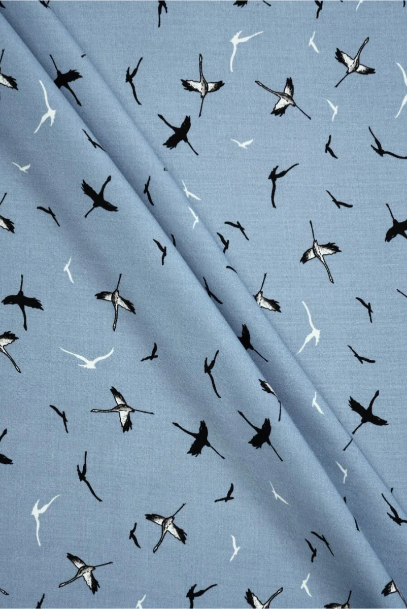 Włoska tkanina 100% wiskozowa w kolorze niebieskim jeansowym z motywem lecących ptaków w kolorze bieli i czerni. Wzór jest rozmieszczony nieregularnie i ma wielkość od 2cm do 4cm. Tkanina jest cienka ale kryjąca, nieelastyczna, miękka i lejąca. Fantastycznie sprawdzi się do uszycia letniej sukienki, spódnicy, bluzki lub szerokich spodni. Idealna tkanina dla osób lubiących oryginalne wzory w spokojnej kolorystyce.