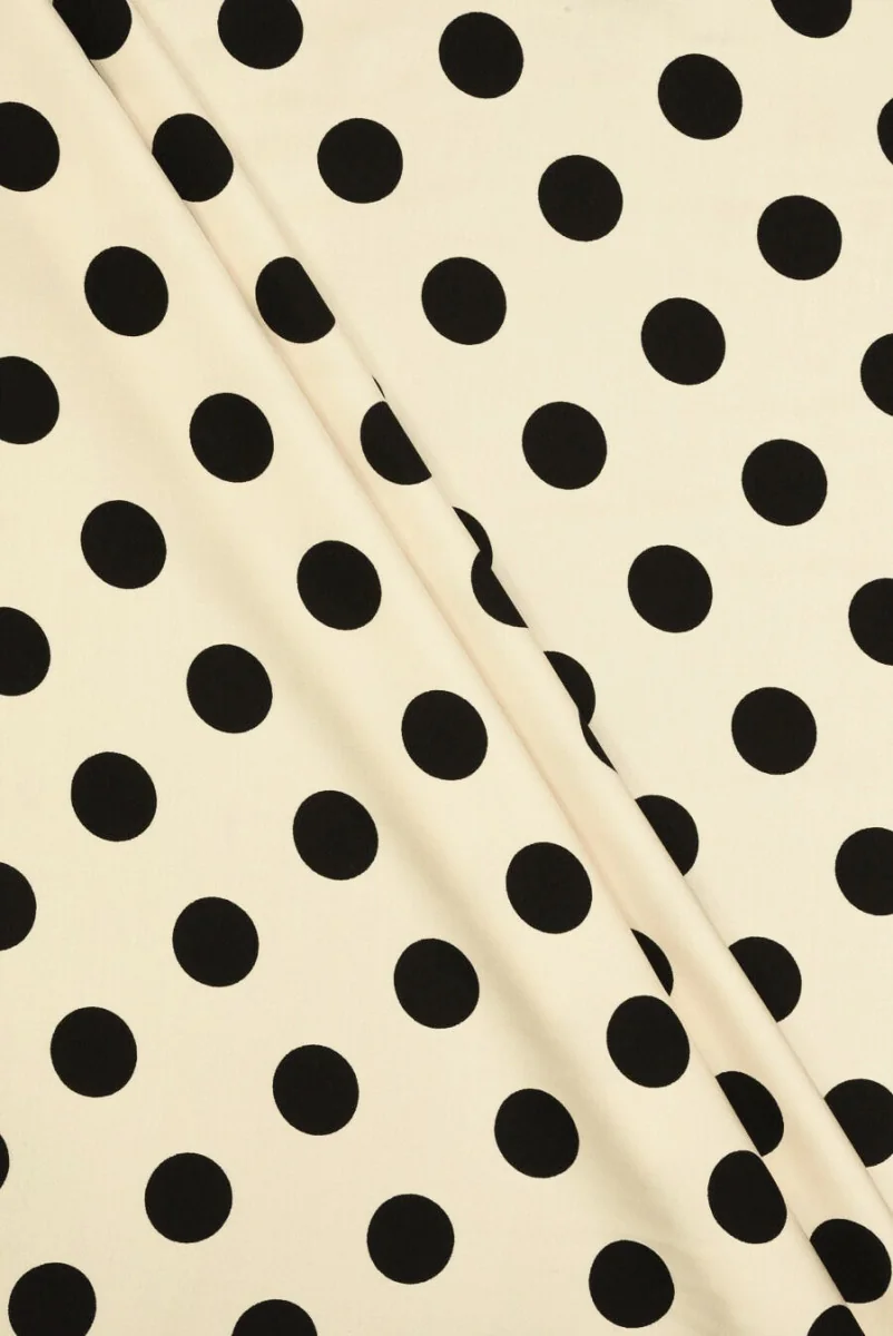 Włoska tkanina 100% wiskozowa w kolorze jasnego beżu z motywem dużych grochów. Wzór jest rozmieszczony regularnie i wykonano go w kolorze czarnym, ma wielkość 2,7cm. Tkanina jest cienka ale kryjąca, nieelastyczna, miękka i lejąca. Fantastycznie sprawdzi się do uszycia letniej sukienki, spódnicy, bluzki lub szerokich spodni. Idealna tkanina dla osób lubiących ponadczasowe wzory w spokojnej kolorystyce.