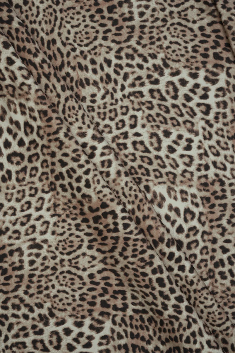 Włoska tkanina 100% wiskozowa w kolorze beżowym z motywem klasycznej panterki. Wzór jest delikatnie cieniowany, drobny i bardzo gęsty. Tkanina jest cienka ale kryjąca, nieelastyczna, miękka i lejąca z delikatnym, szlachetnym połyskiem. Fantastycznie sprawdzi się do uszycia letniej sukienki, spódnicy, bluzki lub szerokich spodni. Idealna tkanina dla osób lubiących zwierzęce wzory.