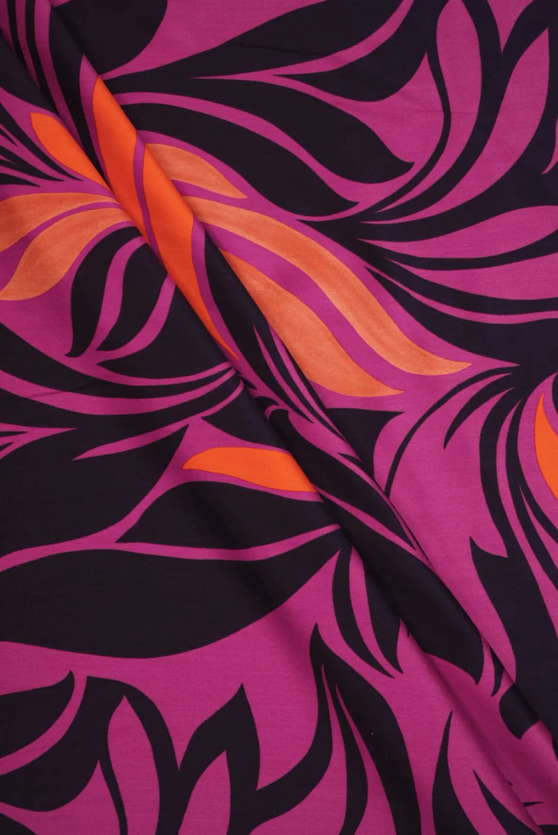 Włoska tkanina 100% wiskozowa z dużym motywem roślinnym. Dominująca kolorystyka to ciemny fiolet i fuksja z akcentami koloru pomarańczowego. Tkanina jest cienka ale kryjąca, nieelastyczna, miękka i lejąca z delikatnym, szlachetnym połyskiem. Fantastycznie sprawdzi się do uszycia letniej sukienki, spódnicy, bluzki lub szerokich spodni. Idealna tkanina dla osób lubiących duże wzory.