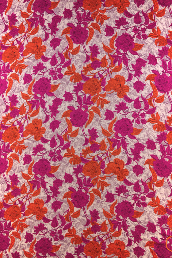 Włoska tkanina 100% wiskozowa z gęstym motywem roślinnym. Tło tkaniny wykonano w kolorze beżowym ze szkicowanymi kwiatami w kolorze fioletowym. Na szkice nałożono gęsto kwiaty w kolorze fuksjowym i pomarańczowym. Tkanina jest cienka ale kryjąca, nieelastyczna, miękka i lejąca z delikatnym, szlachetnym połyskiem. Fantastycznie sprawdzi się do uszycia letniej sukienki, spódnicy, bluzki lub szerokich spodni. Idealna tkanina dla osób lubiących duże wzory.