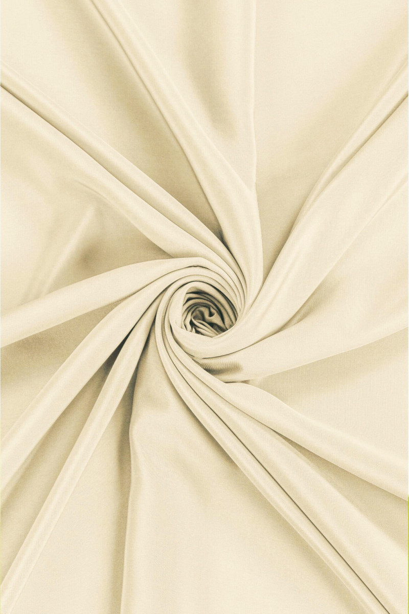 Włoska tkanina typu krepa utkana z acetatu z domieszką jedwabiu naturalnego w kolorze waniliowym. Krepa to tkanina o charakterystycznym, półmatowym wykończeniu. Ma delikatnie skręcony splot, który sprawia, że tkanina ma drobną strukturę.