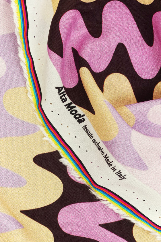 Włoska tkanina 100% wiskozowa z motywem geometrycznym przypominającym zygzaki. Wzór jest gęsty i ułożony poziomo w kolorach: żółtym, fioletowym oraz brązowym. Tkanina jest cienka ale dobrze kryjąca, nieelastyczna, lekka i lejąca. Może mieć zastosowanie w wielu odzieżowych projektach, gdyż świetnie sprawdzi się na bluzki, koszule, sukienki, spódnice, kimona a także luźniejsze spodnie czy szorty.
