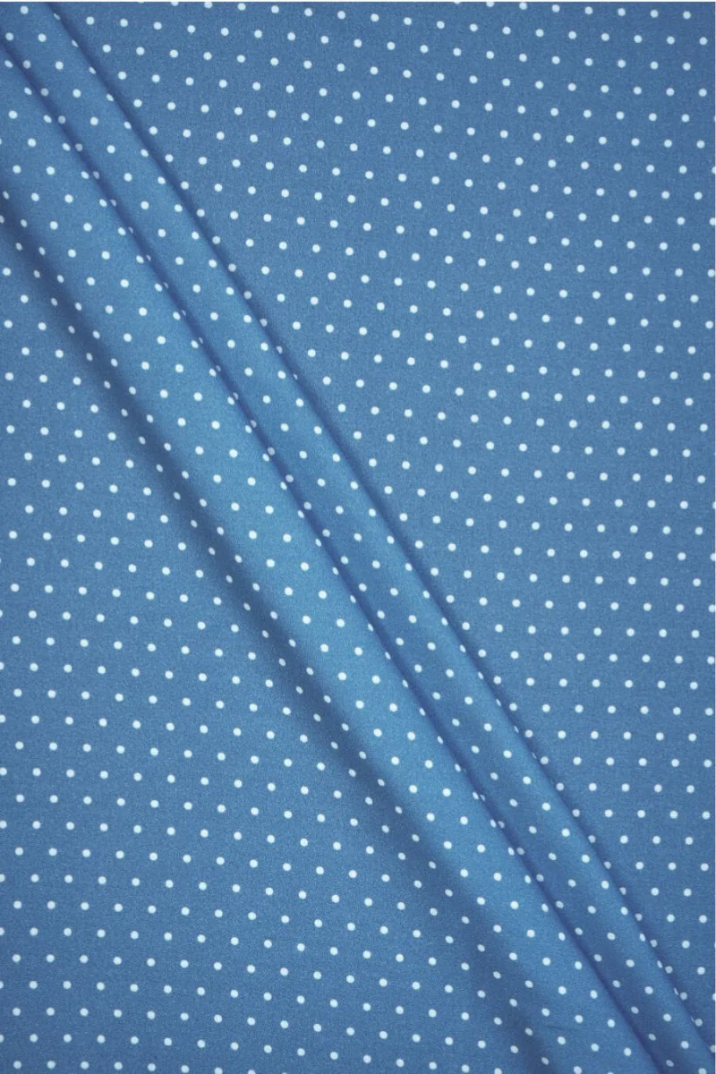 Włoska tkanina 100% wiskozowa w kolorze niebieskim - jeansowym z motywem groszków. Wzór występuje w kolorze śmietanowym i ma średnicę 0,3cm. Rozmieszczono go gęsto i regularnie. Tkanina jest nieelastyczna, miękka o żorżetowym splocie. Wykonana w 100% z naturalnych włókien, dlatego idealnie sprawdzi się do uszycia wiosennych oraz letnich ubrań. Super tkanina dla fanów ponadczasowych wzorów.