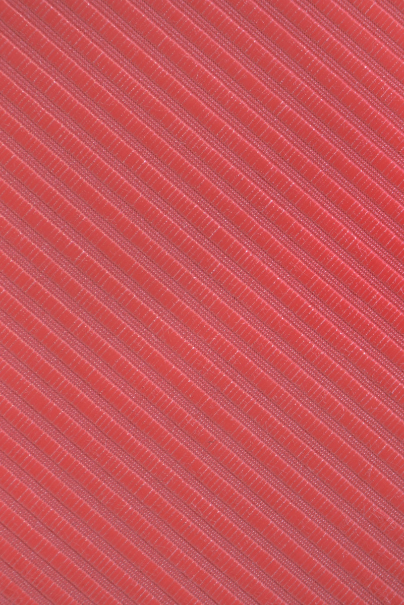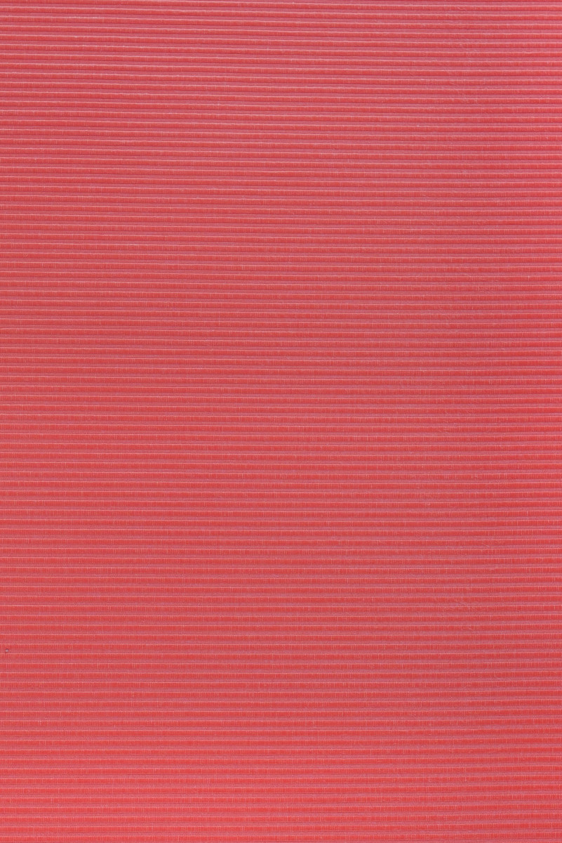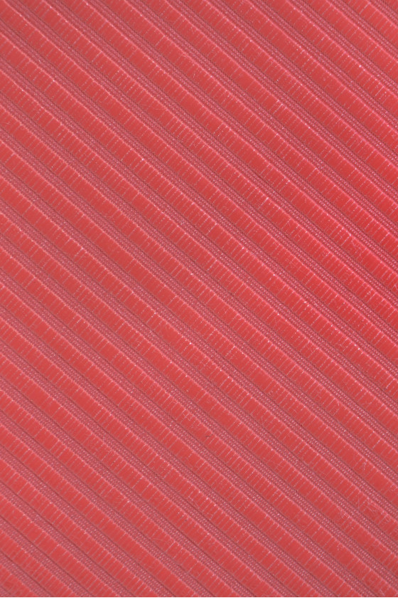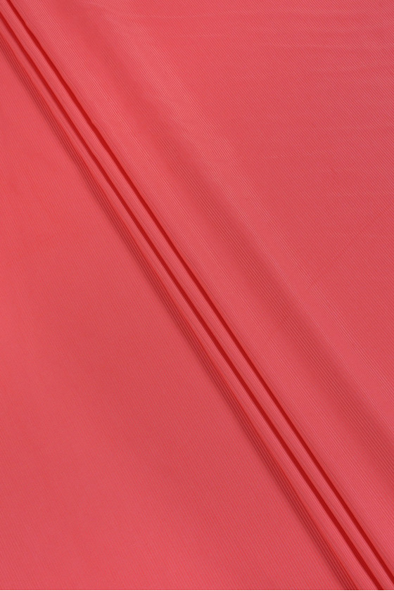 Tkanina z charakterystycznym rypsem w kolorze koralu. Tkanina nieelastyczna, lekko sztywna, z delikatnym połyskiem, gładka w dotyku.