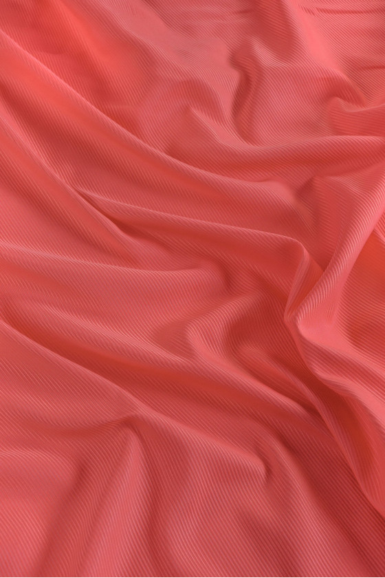 Tkanina z charakterystycznym rypsem w kolorze koralu. Tkanina nieelastyczna, lekko sztywna, z delikatnym połyskiem, gładka w dotyku. Idealna cienkie płaszczyki, kurtki, spódnice