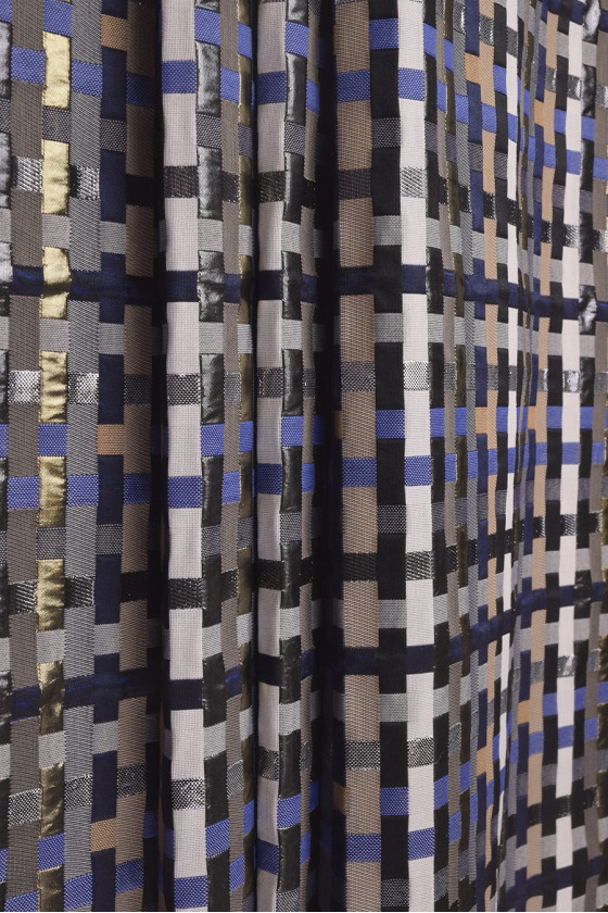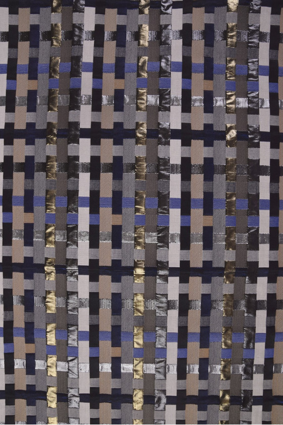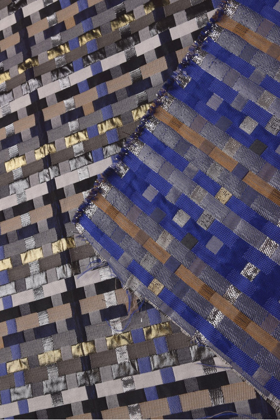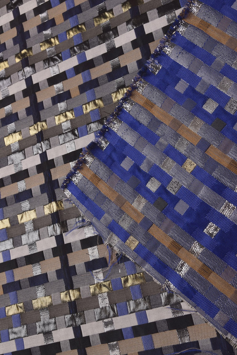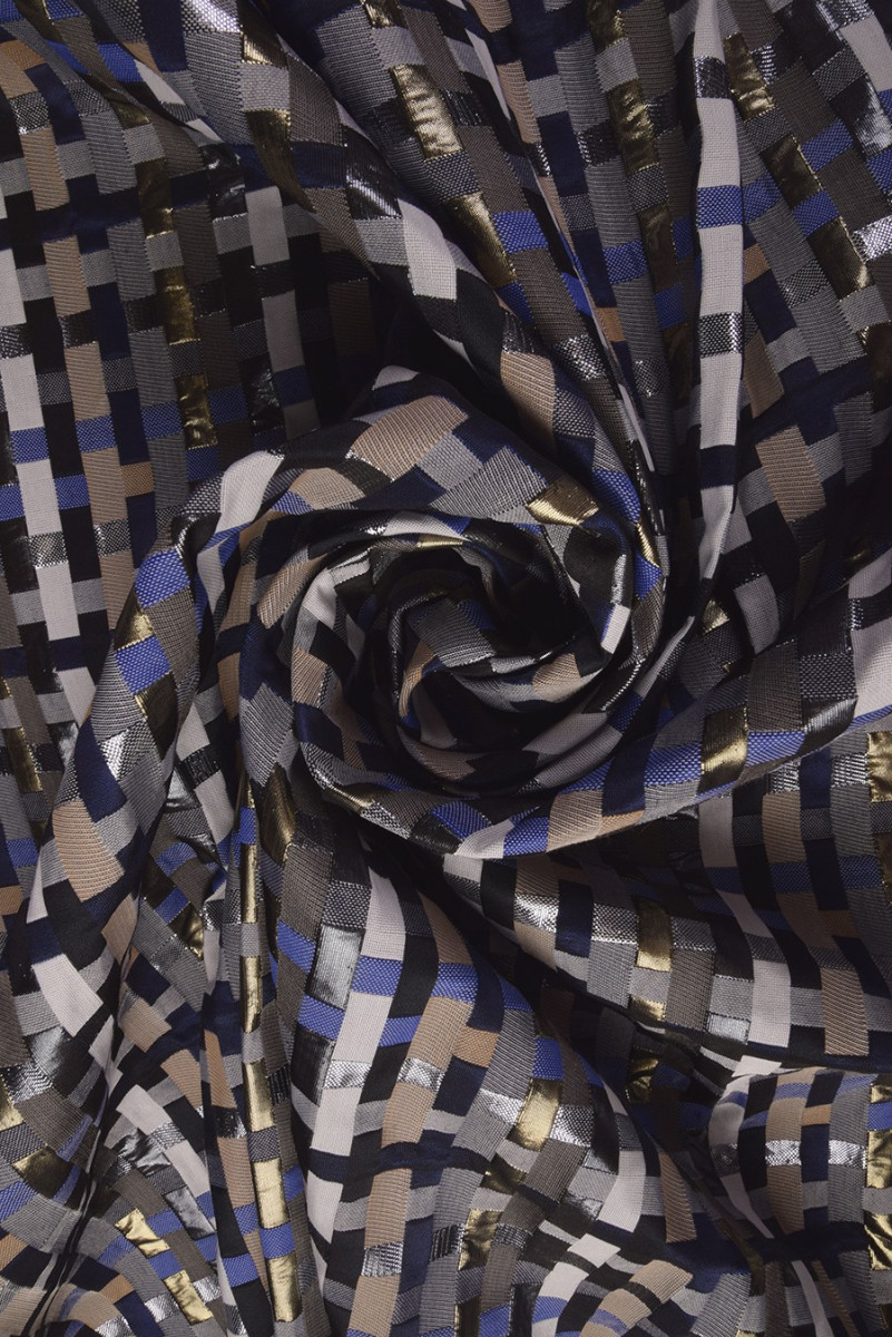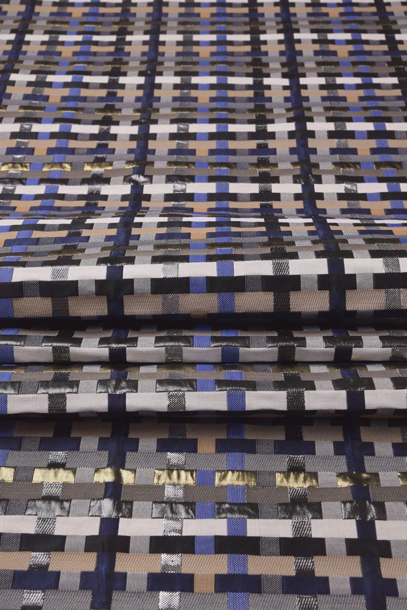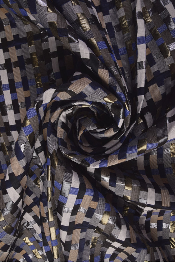 Włoska tkanina kostiumowa typu żakard - multikolorowa. Wzór tutaj tworzą przeplecione ze sobą paseczki o szerokości 1cm w różnych kolorach, min. granatowym, szarym, beżowym, niebieskim oraz złotym. Tkanina jest cienka, nieelastyczna ale sztywna, ładnie trzyma formę, przypomina taftę. Idealnie sprawdzi się do uszycia szerokiej spódnicy, sukienki lub cienkiego, ozdobnego płaszcza.