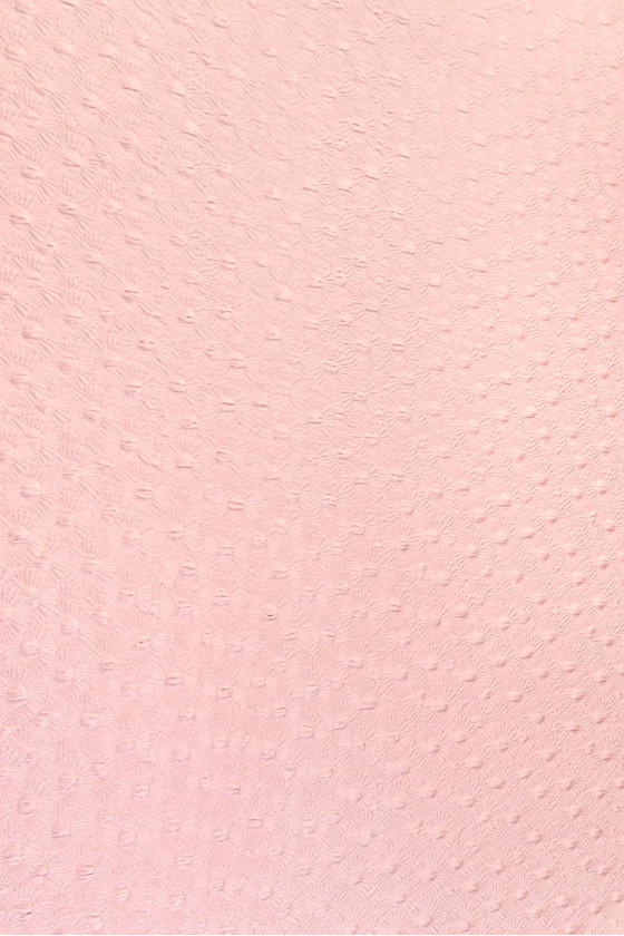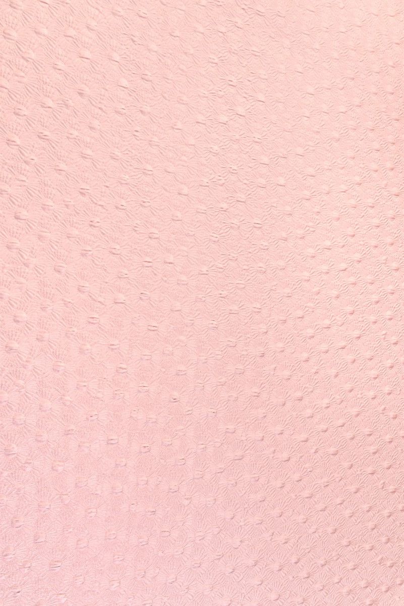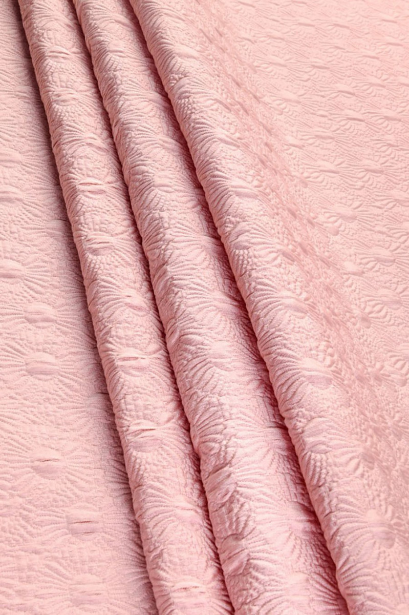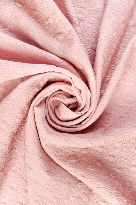 Włoska tkanina kostiumowa typu żakard w kolorze jasnego różu. Bardzo oryginalny, tłoczony wzór nachodzących na siebie kwiatów stokrotki o wielkości ok 4cm. Całość wykonana jest w jednym kolorze co sprawia, że wzór jest bardzo subtelny i delikatny. Tkanina ma średnią grubość, jest matowa i lekko sztywna. Idealnie sprawdzi się do uszycia kostiumu, sukienki, płaszcza lub do celów dekoracyjnych.