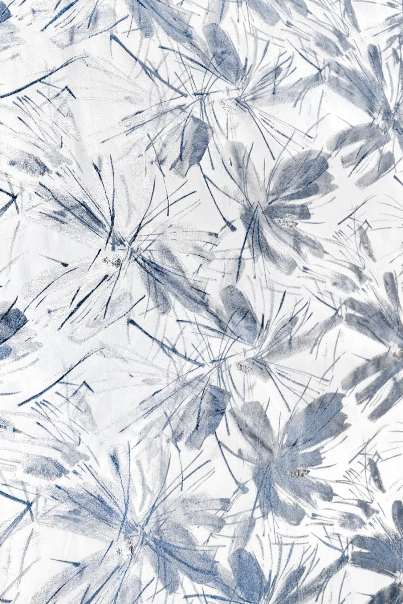 Włoska tkanina kostiumowa typu żakard w kolorze jasnej szarości. Materiał ma piękny, duży wzór rozmytych kwiatów w kolorze szarości z kroplą fioletu. Całość zdobi błyszcząca srebrna nitka, która nadaje jej eleganckiego wyglądu. Jest to super propozycja do uszycia sukni lub kostiumu na specjalną okazję typu komunia, wesele.