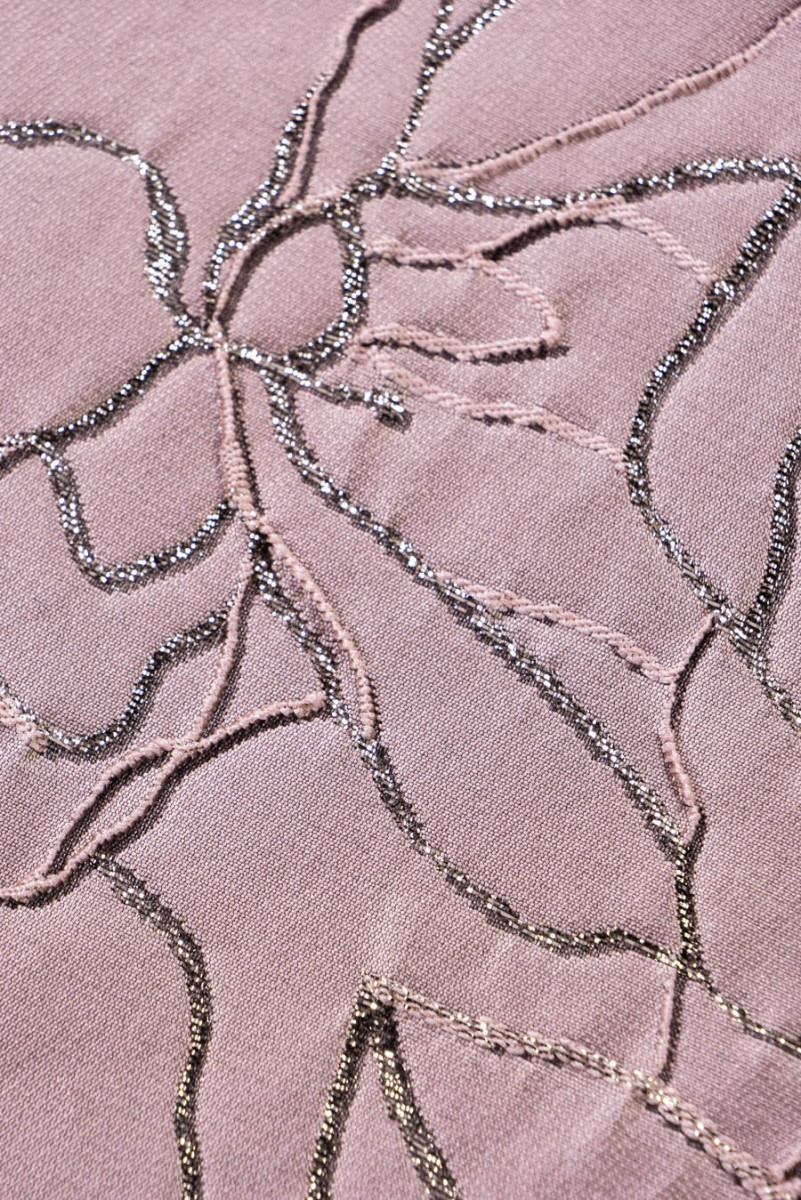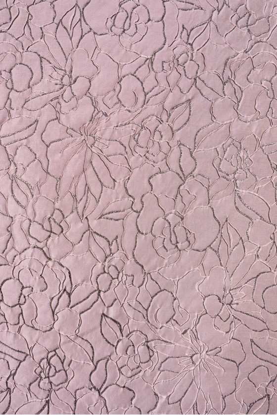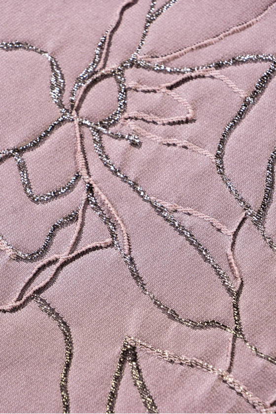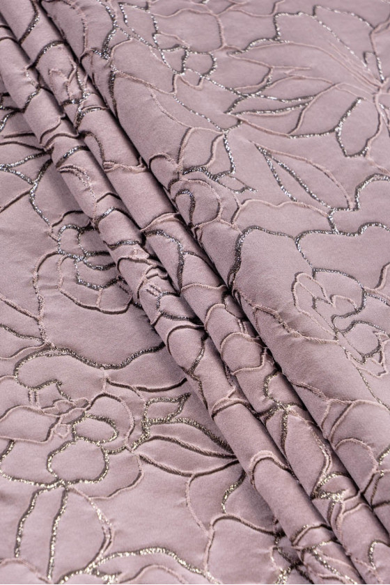 Włoska tkanina kostiumowa typu żakardy w kolorze brudnego różu. Piękny zarys dużych kwiatów obszytych nitką w kolorze tła oraz srebrną, błyszczącą nitką. Tkanina dzięki temu nabiera delikatnej struktury, jest lekko sztywna - idealna na uszycie sukni, spódnicy, kostiumu lub płaszcza płaszcza.