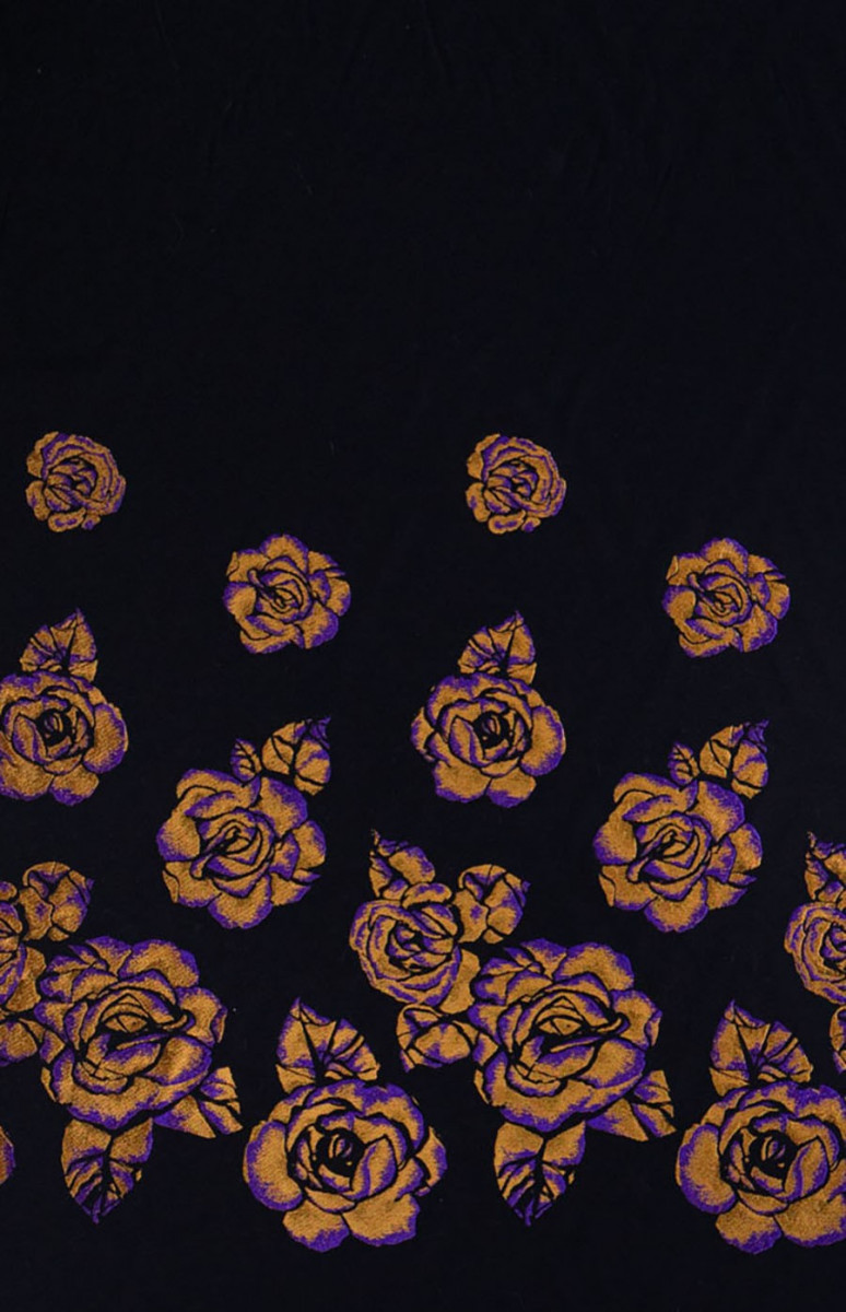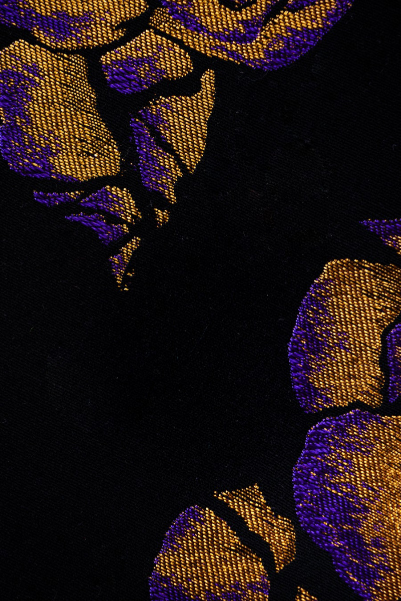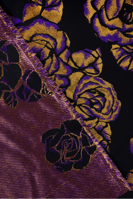 Włoska tkanina typu żakard z motywem błyszczących, złoto-fioletowych kwiatów na czarnym tle. Tkanina występuje w kuponie o wymiarach 120 cm* 150 cm.