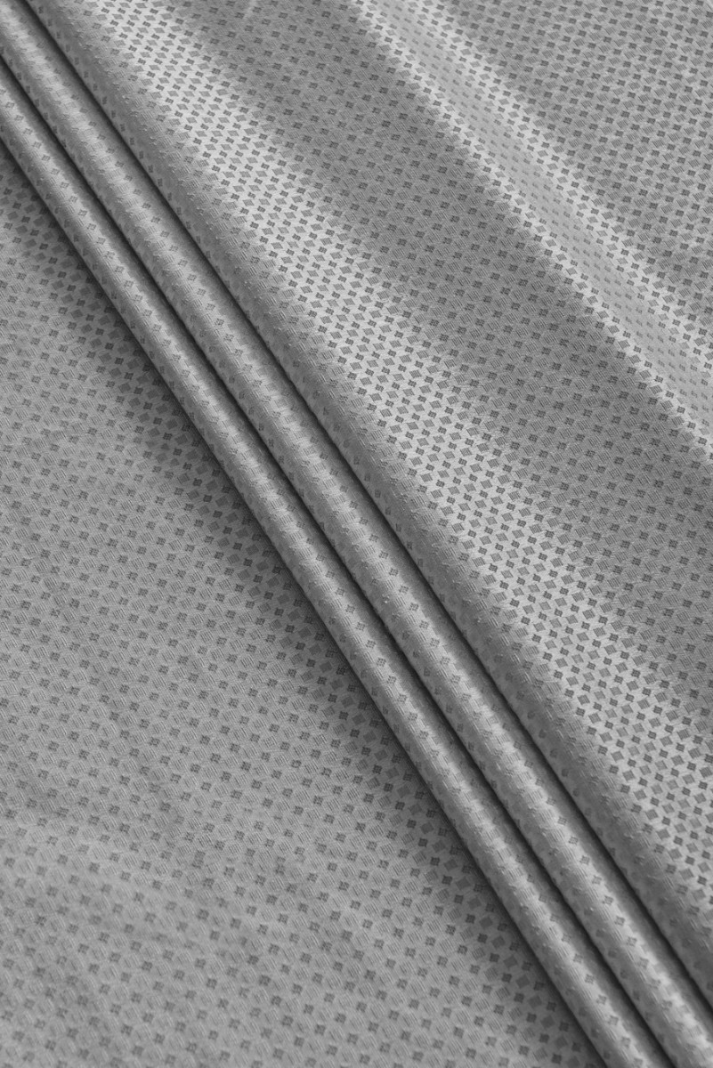 Włoska tkanina kostiumowa typu żakard w kolorze srebrnej szarości. Materiał z bardzo drobnym wzorem geometrycznym - romby oraz kwadraty. Tło tkaniny jest lekko błyszczące a wzór matowy. Tkanina jest cieńsza, sztywna z lekkim połyskiem - idealna do uszycia sukienki, spódnicy, kostiumu, spodni.