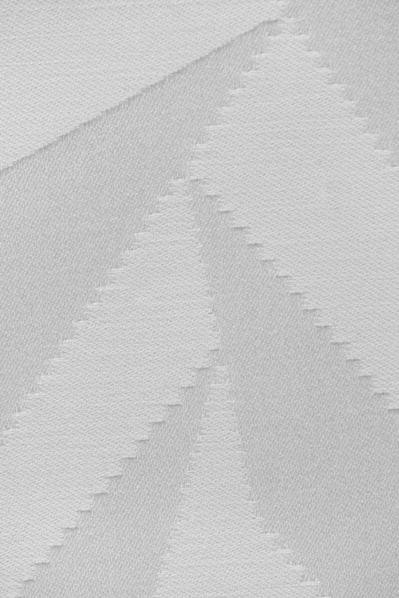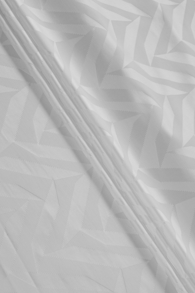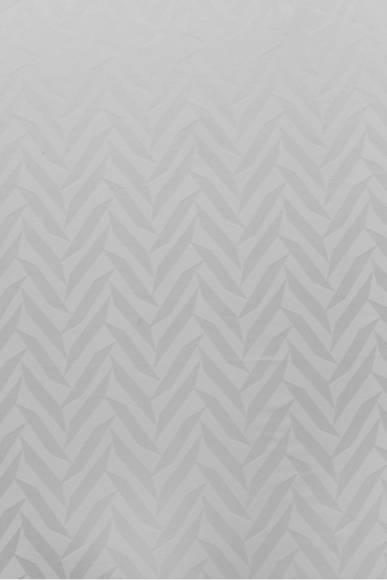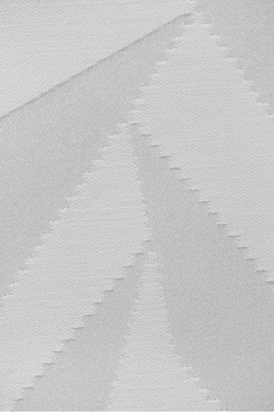 Włoska tkanina kostiumowa typu żakard w kolorze śmietanowym. Bardzo ciekawy, lekko błyszczący, geometryczny wzór wykonano na matowym tle. Tworzy on pionowe pasy, które przypominają gałązki. Tkanina jest mięsista, nieelastyczna, lekko sztywna - idealna do uszycia kostiumu, sukni, spódnicy, żakietu.