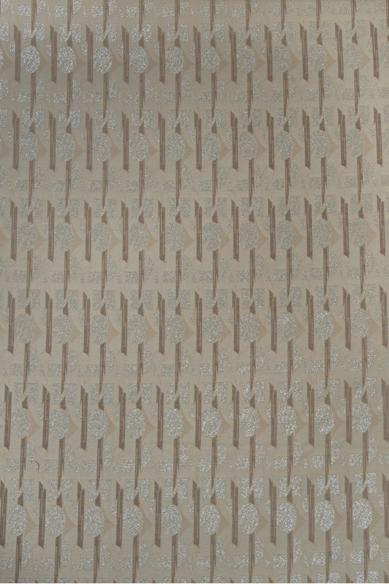 Włoska tkanina kostiumowa typu żakard w odcieniach beżu. Tło tkaniny ma kolor jasnego beżu z motywem geometrycznym w kolorze ciemnego beżu. Wzór jest regularny i tworzy poziome pasy, dodatkowo ozdobiono go srebrną, błyszczącą nitką, która dodaje mu elegancji. Tkanina jest grubsza, sztywna, nieelastyczna z charakterystycznym połyskiem. Idealna do uszycia sukni, kostiumu, spódnicy lub do celów dekoracyjnych.