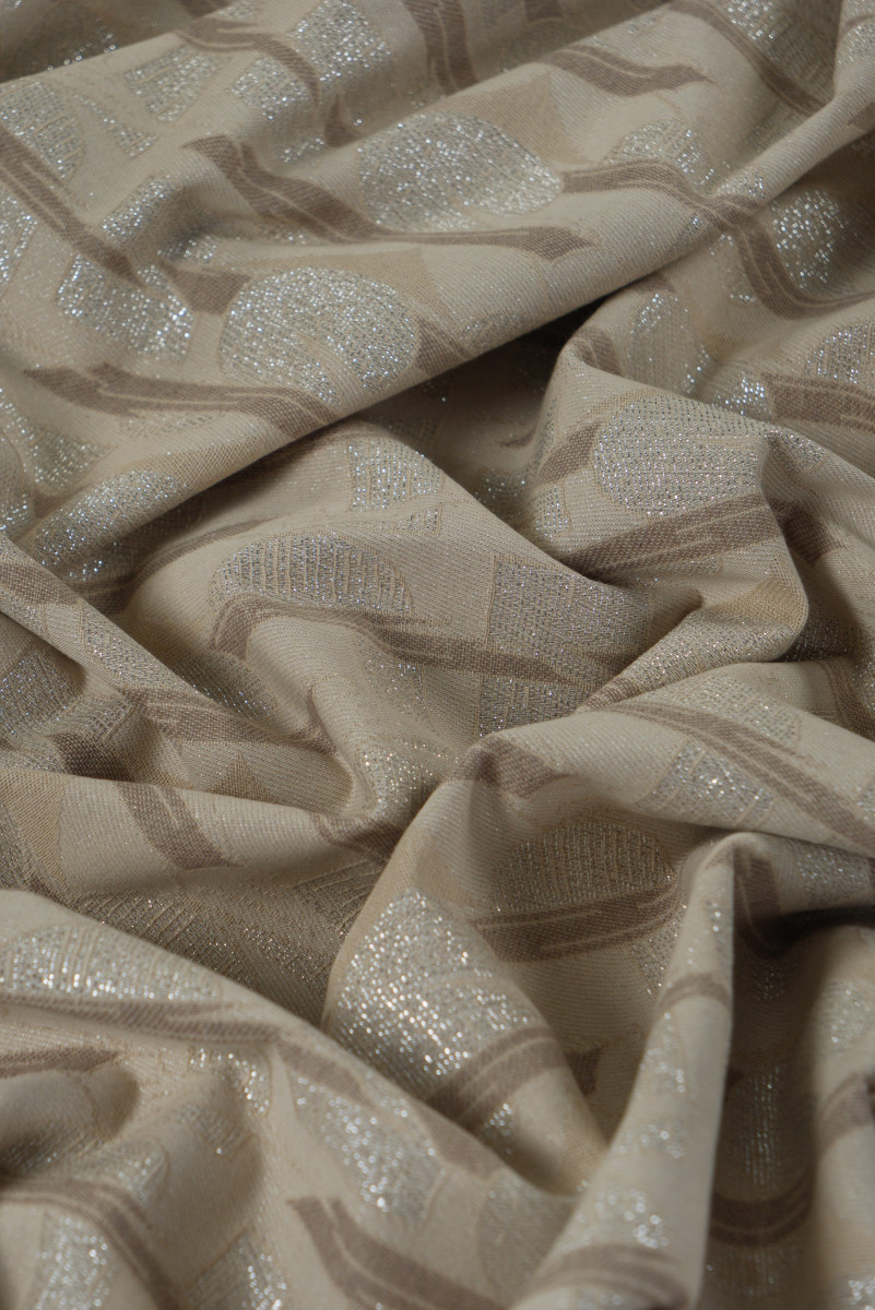 Włoska tkanina kostiumowa typu żakard, beżowa w geometryczne wzory, ozdobione srebrną nitką lureksową. Tkanina grubsza, sztywna, nieelastyczna z charakterystycznym połyskiem.