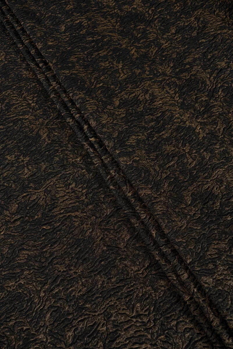 Włoska tkanina kostiumowa typu żakard w czarno-miedziane, wyduszane wzory. Tkanina jest grubsza, lekko sztywna, nieelastyczna z delikatnym połyskiem o wyraźnej, wypukłej strukturze. Idealnie sprawdzi się do uszycia sukni, spódnicy, kostiumu, cienkiego płaszcza lub do celów dekoracyjnych.