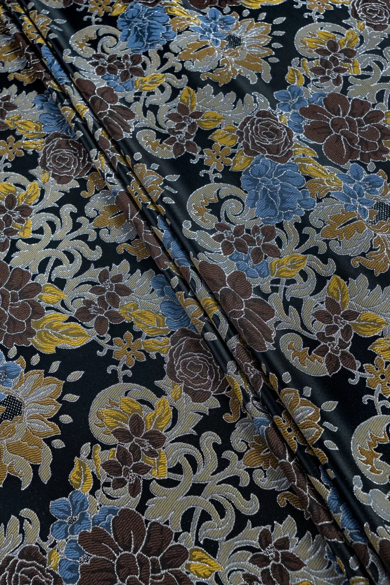 Włoska tkanina kostiumowa typu żakard w kolorze czarnym z motywem kwiatów w kolorach: brązowym, musztardowym i niebieskim. Tkanina grubsza, sztywna, ciekawie ozdobiona srebrną nitką lureksową.