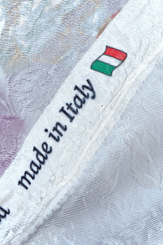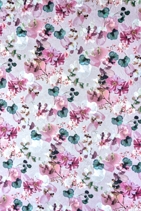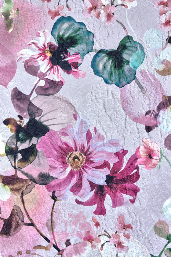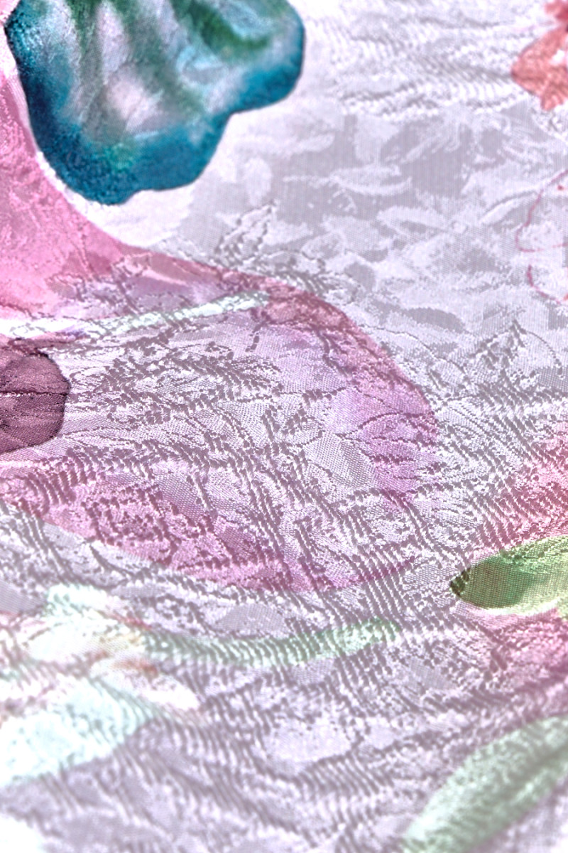 Włoska tkanina żakardowa w piękny, kwiatowy motyw w jasnych i ciemnych odcieniach różu na jasno różowym tle, całość wzoru wzbogacają motywy ciemno zielonych liści. Tkanina posiada gęsty, ale delikatny wytłaczany roślinny wzór. Jest mięsista, kryjąca, nieelastyczna, ładnie się układa. Oryginalna propozycja, która sprawdzi się w uszyciu sukienki, spódnicy, żakietu i spodni.